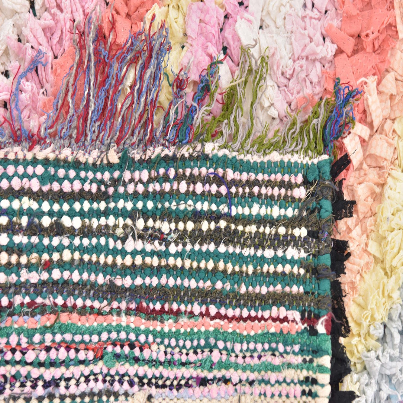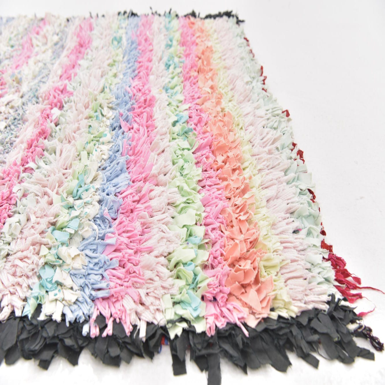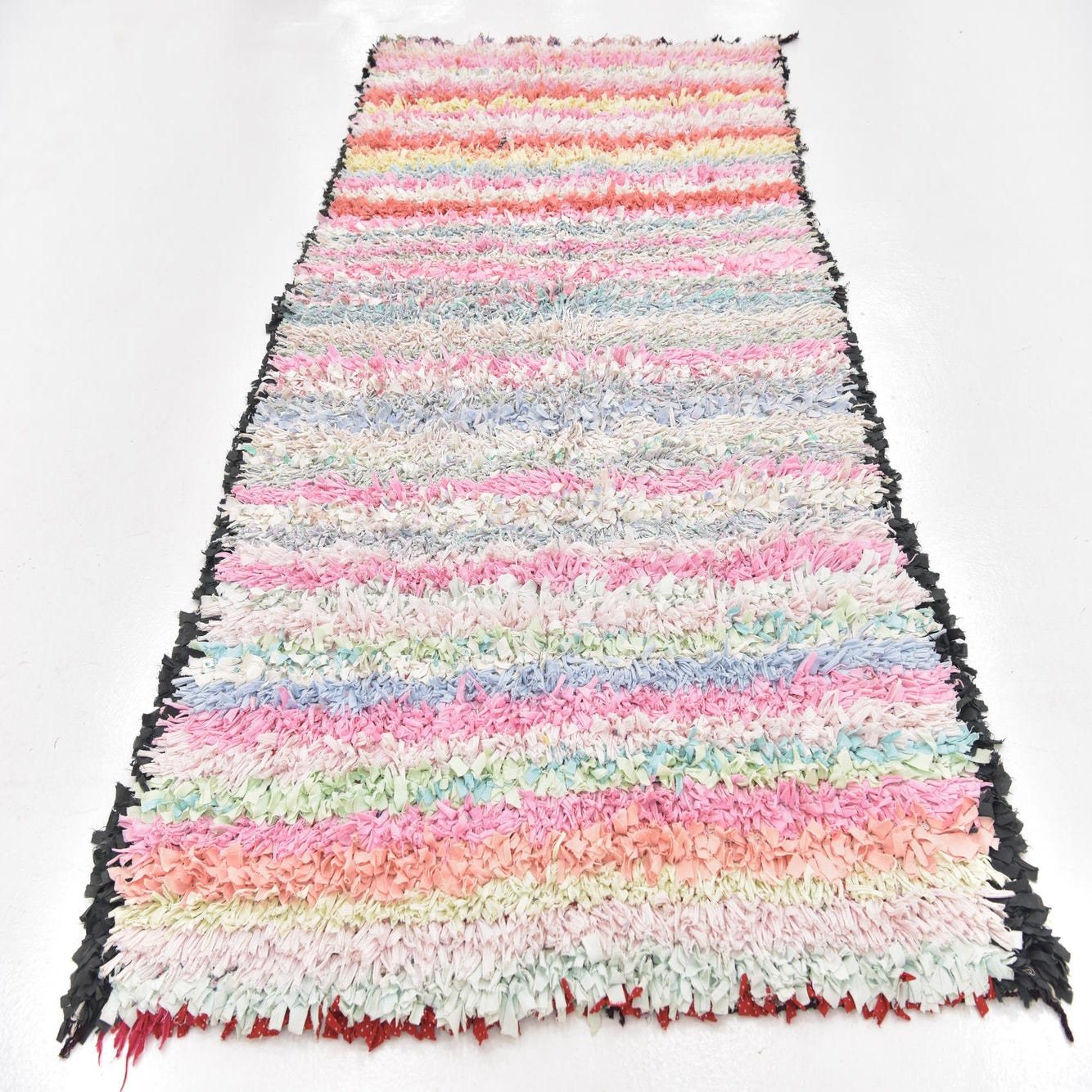 A 5x8 rectangular Moroccan shag rug with horizontal stripes in various pastel pinks, blues, yellows, and whites, framed by dark fringed edges.