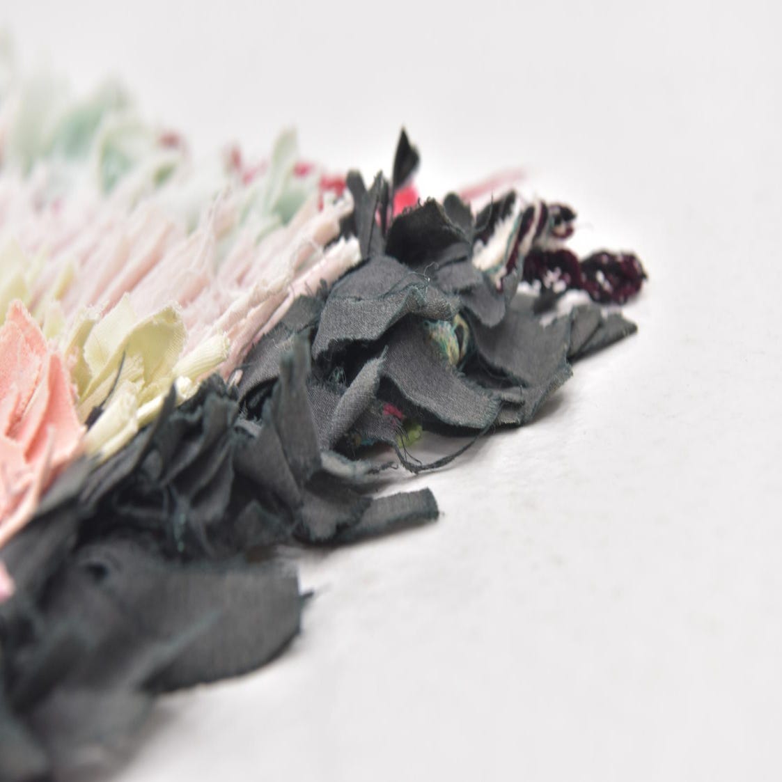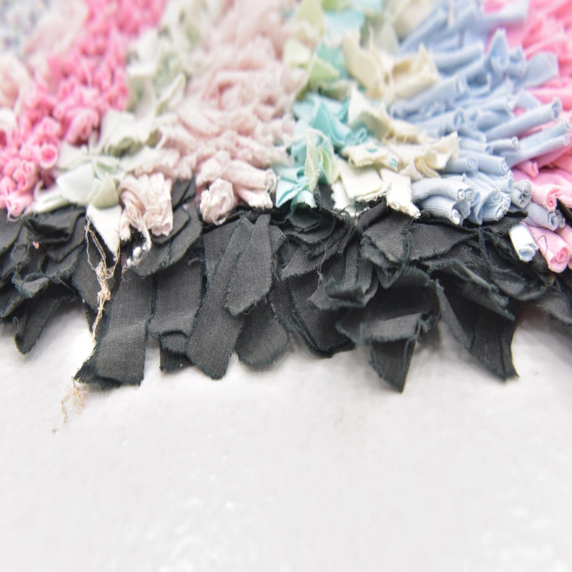 Primary color is Pink. Colors in this rug include: Pink, Black, Ivory, Light Blue, Light Green, Orange.