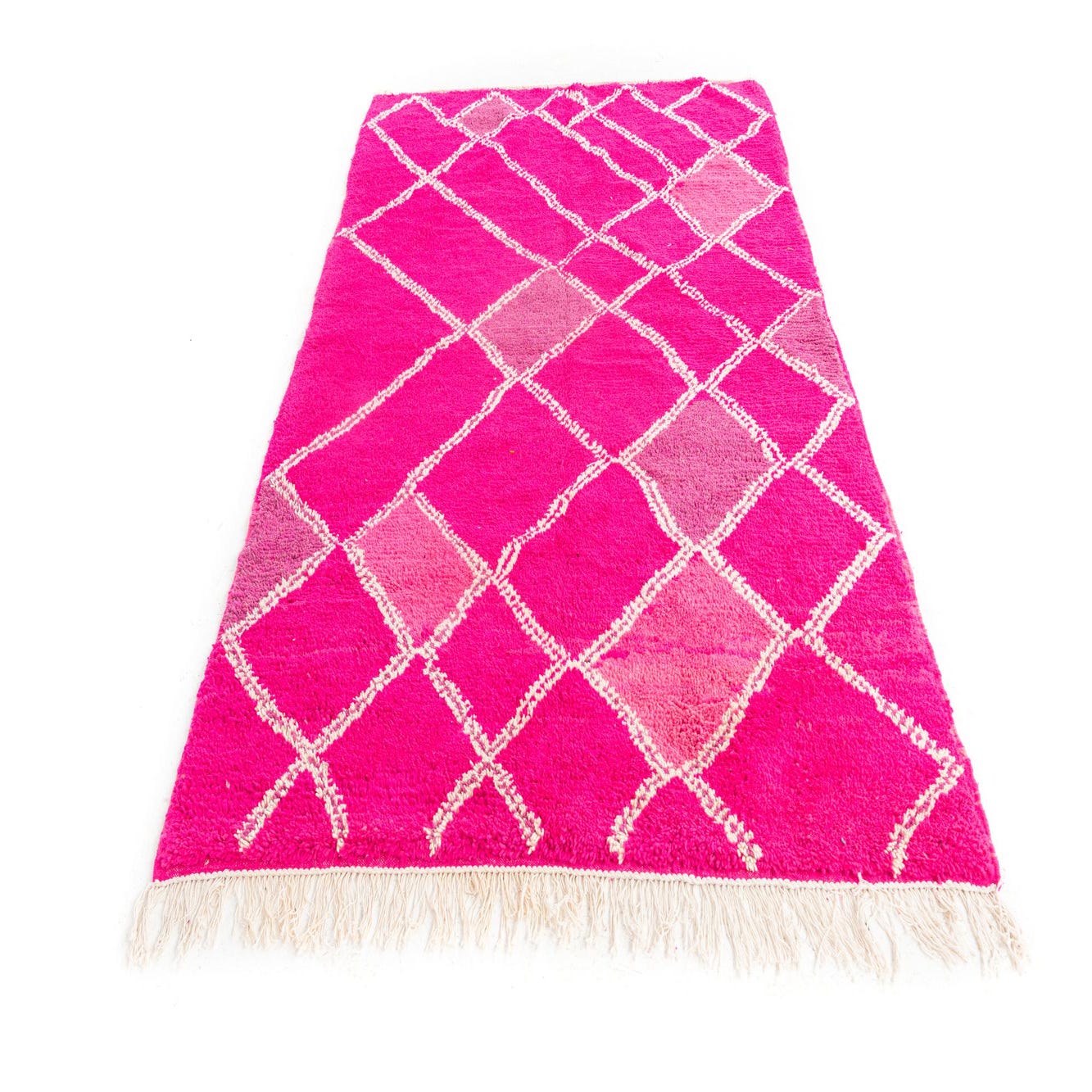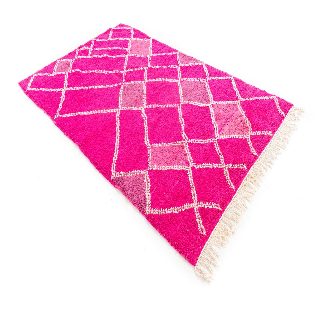 The pattern features a classic diamond lattice that is synonymous with Moroccan motifs, adding both visual interest and cultural depth. This rug is finished with a fringe edge that complements its artisanal quality.