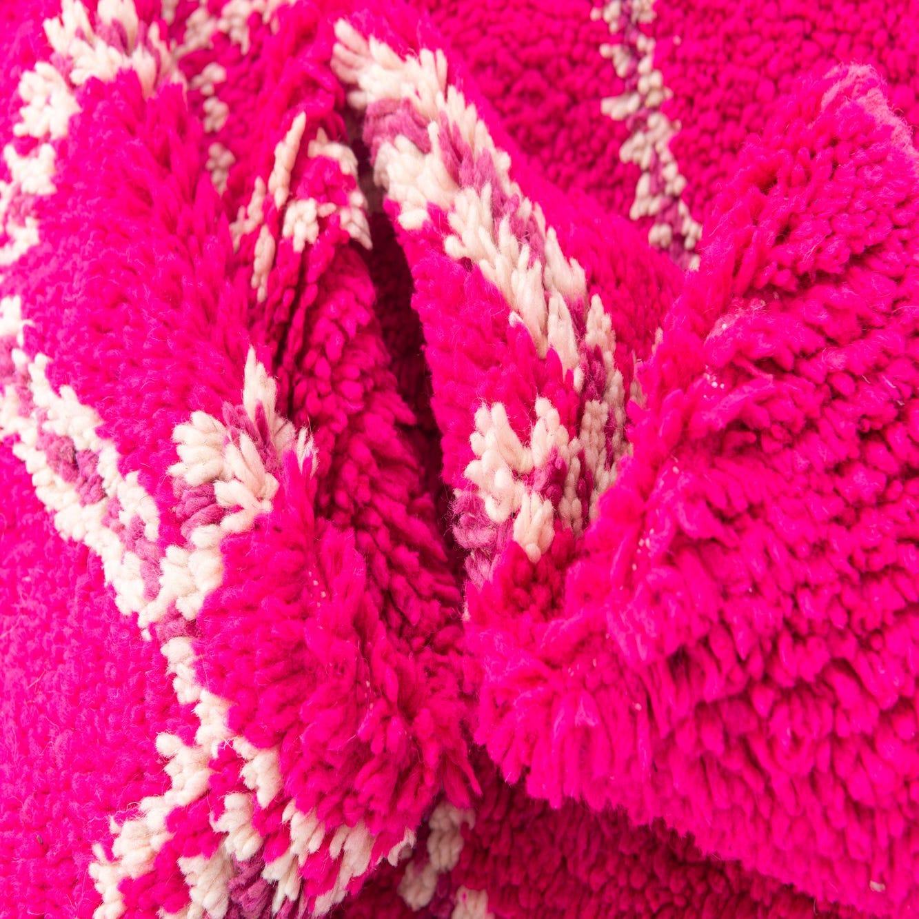 A vibrant 5x8 rectangular pink shag rug with a white tribal diamond pattern and subtle pink color variations, featuring fringe.