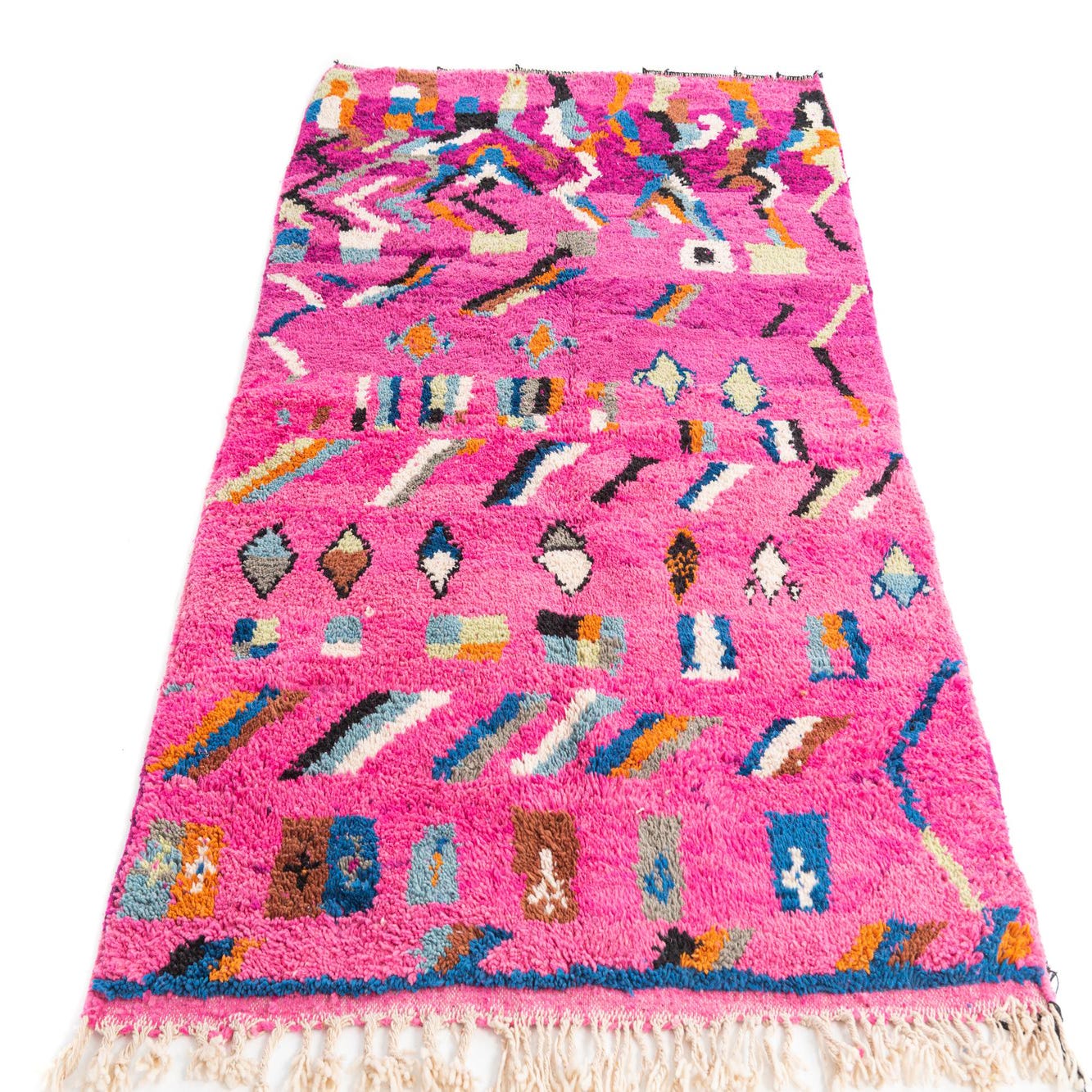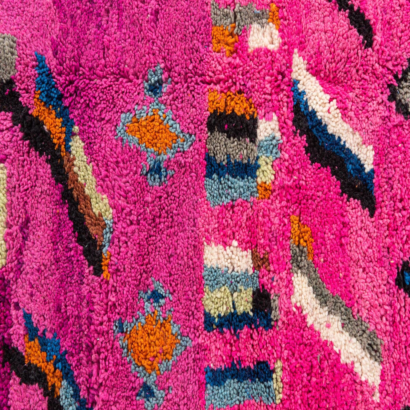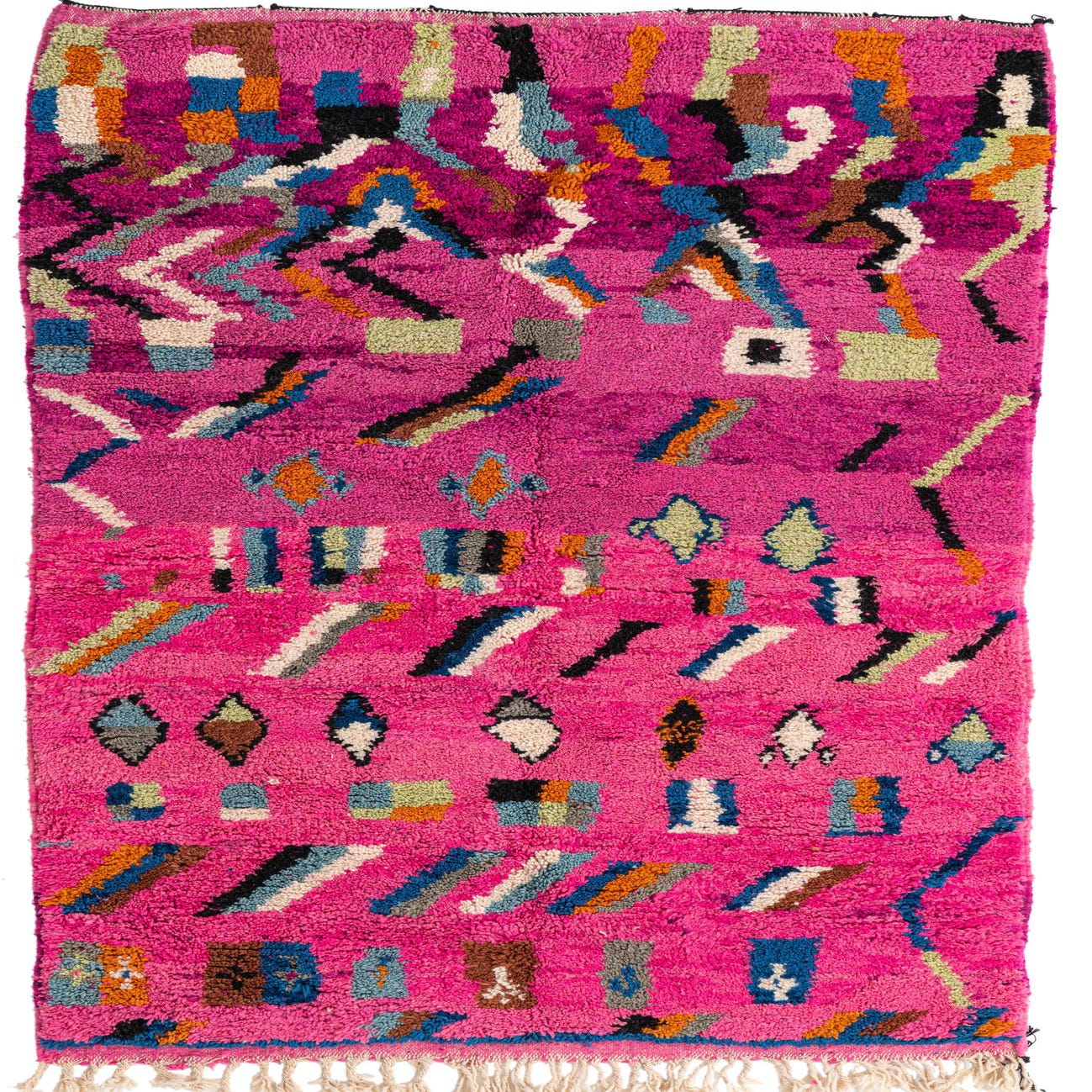 This Moroccan Collection rug brings a vibrant splash of color and a rich, tactile experience to any living space. Hand-knotted from 100% wool, this 5x8 area rug features a bold and dynamic pattern. The pink background provides a vivacious canvas for the contrasting hues of black, blue, brown, light green, and light blue to stand out. Its texture is a testament to the quality and craftsmanship of traditional techniques.