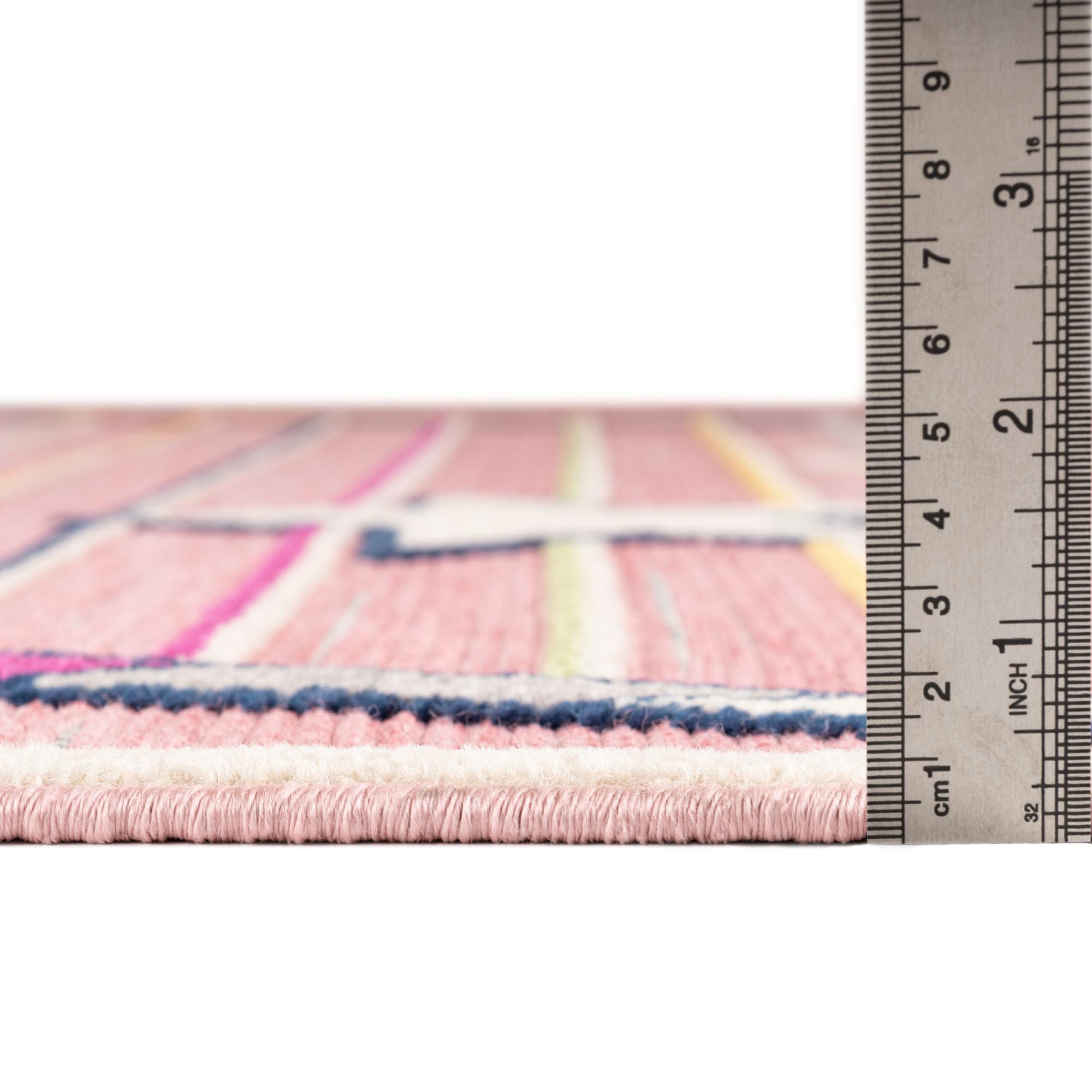A 5x8 rectangular pink rug with colorful stripes, featuring playful whales, stars, a sailboat, and ship wheels, framed by a colorful rope border, perfect for a child's room or play area.