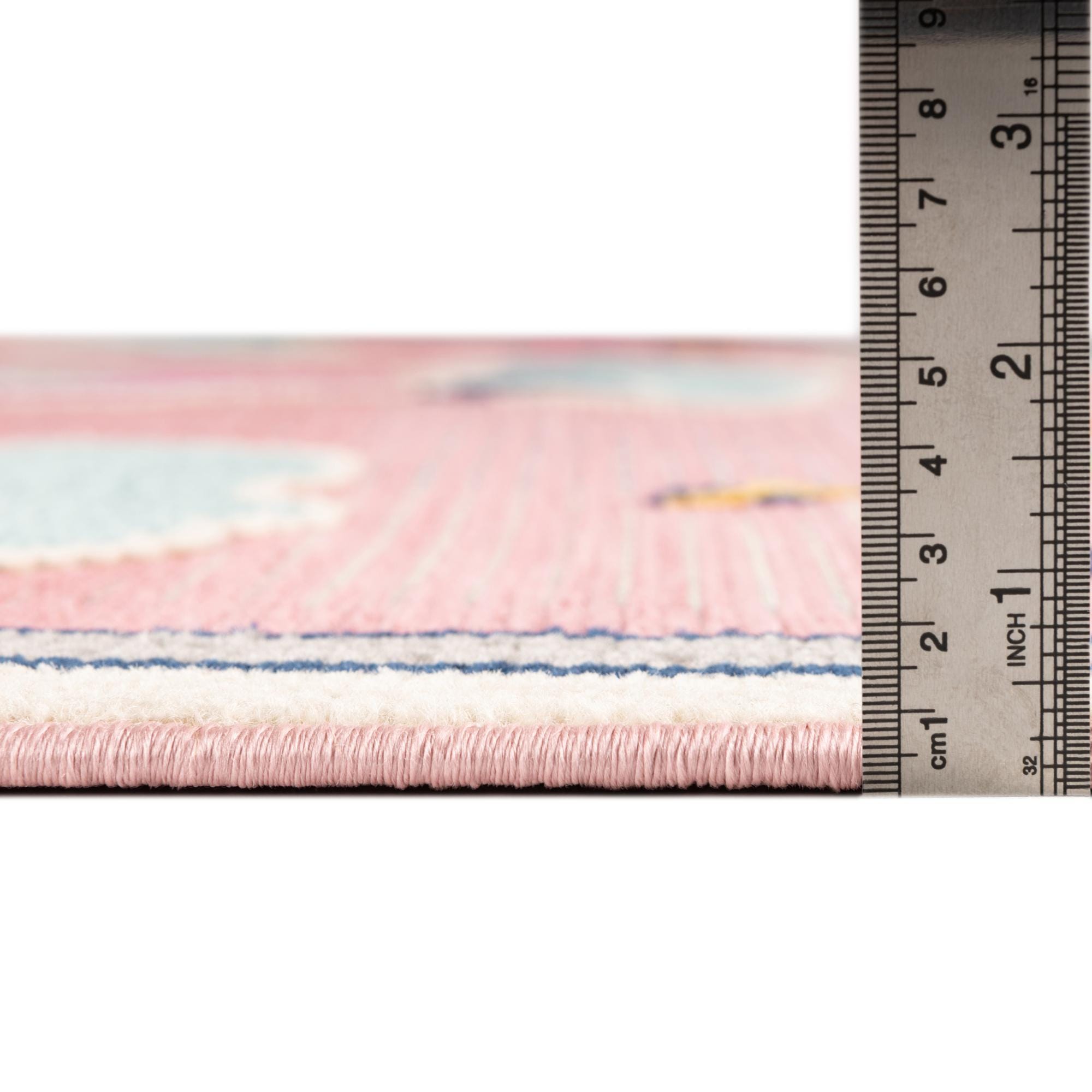 A 5x8 pink rectangular rug with a playful pattern of colorful hot air balloons, blue clouds, and small stars, suitable for a child's room or patio.