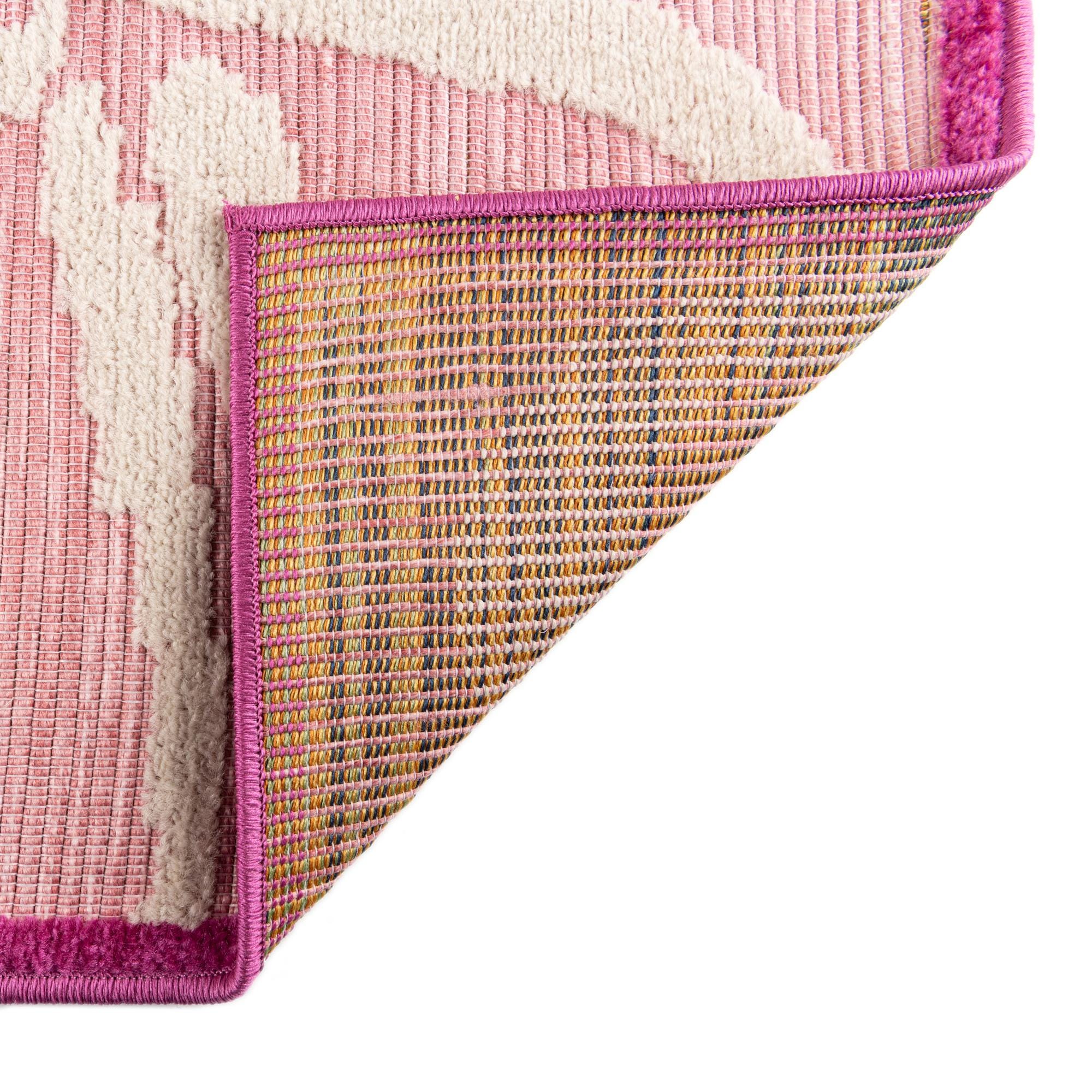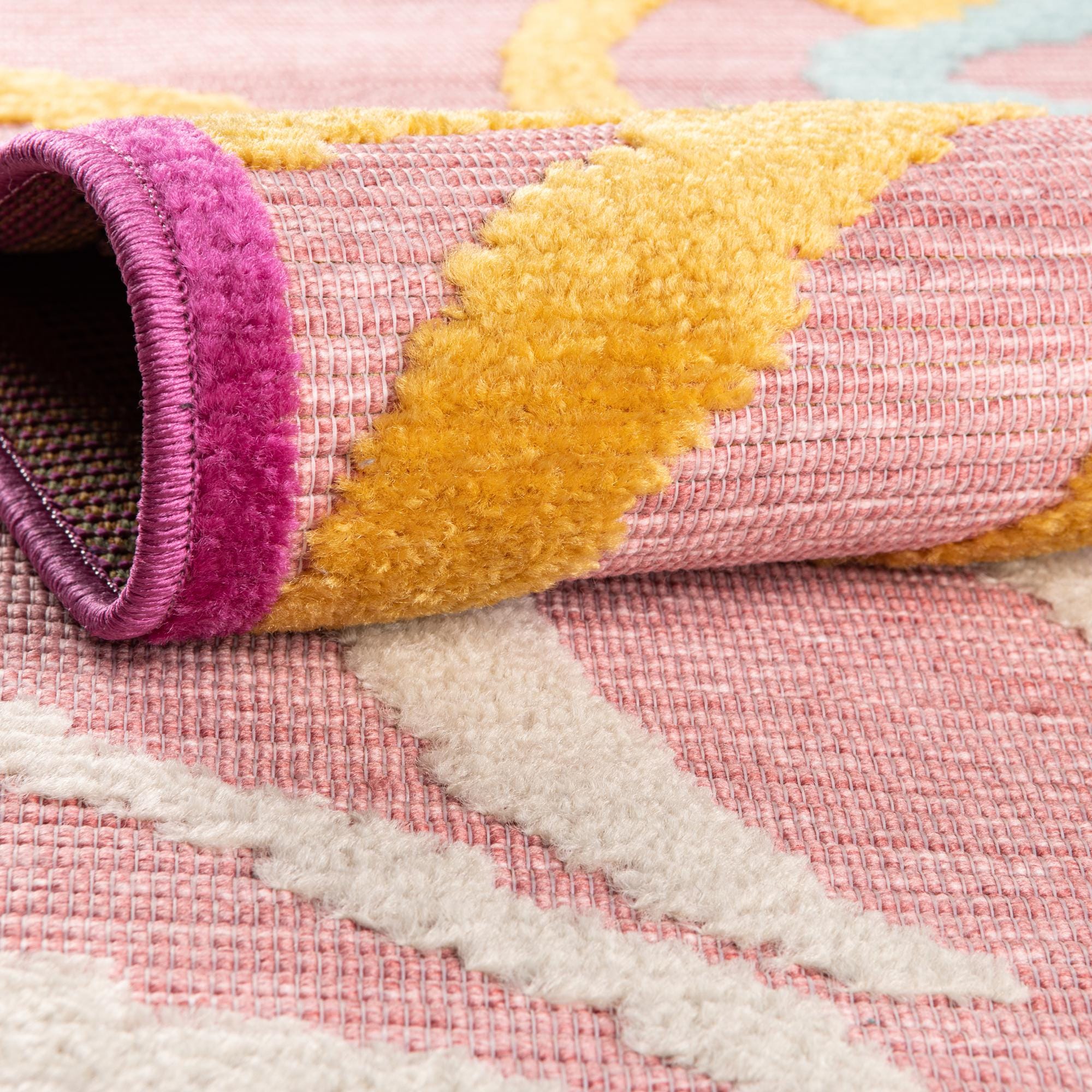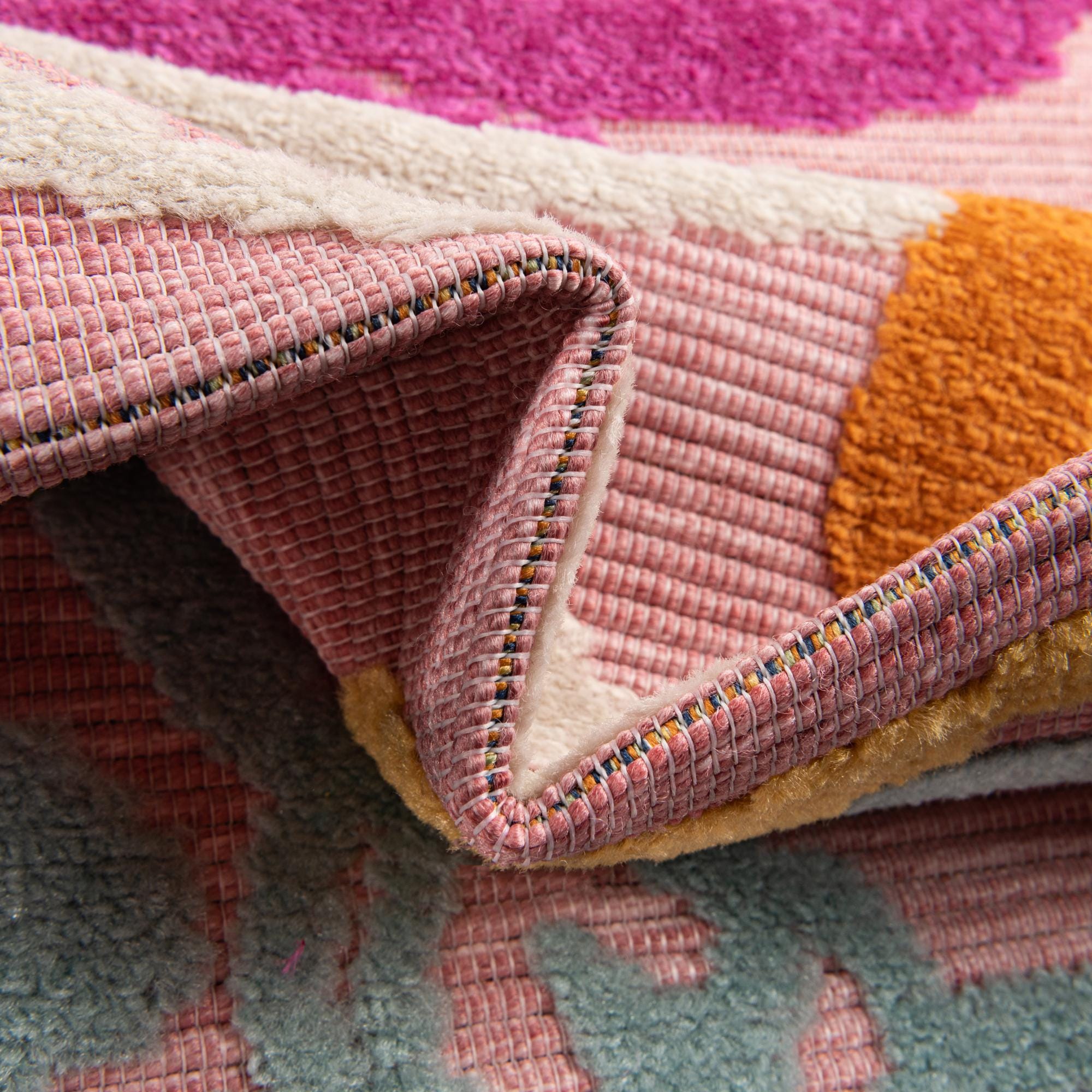 Primary color is Pink. Colors in this rug include: Pink, Ivory, Orange, Navy Blue, Yellow.