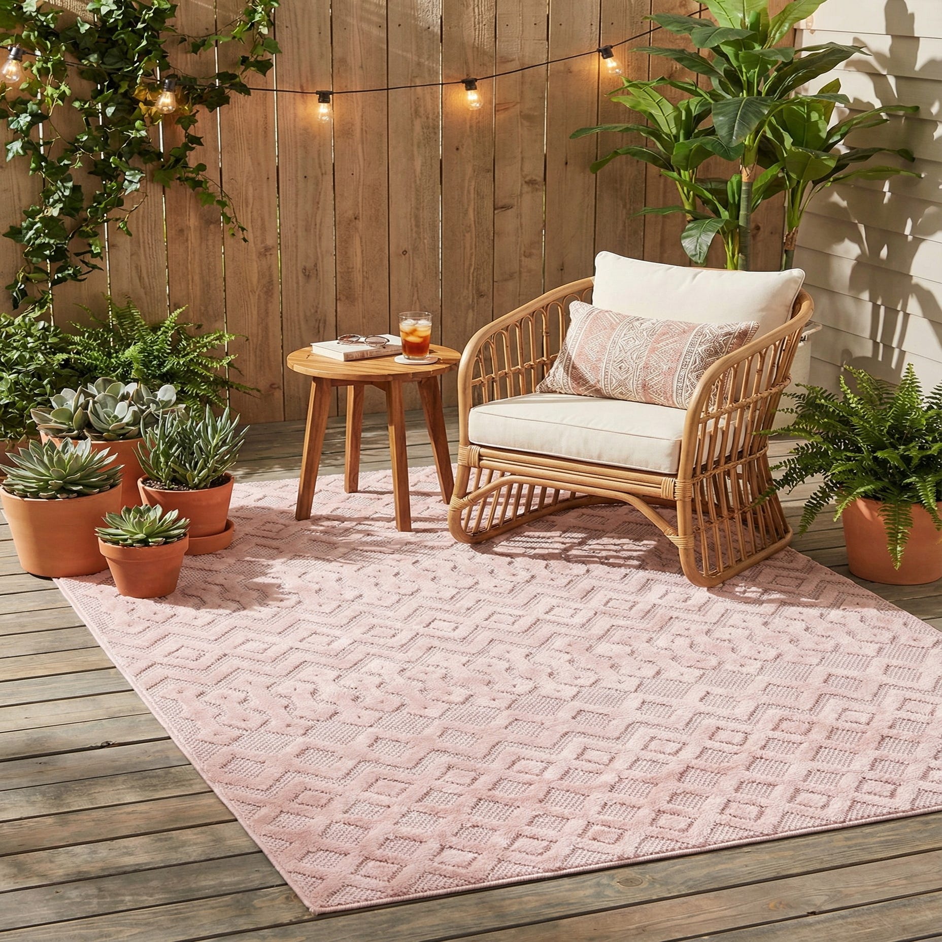 A 5x8 rectangular pink indoor/outdoor rug with a textured high/low tribal trellis pattern.