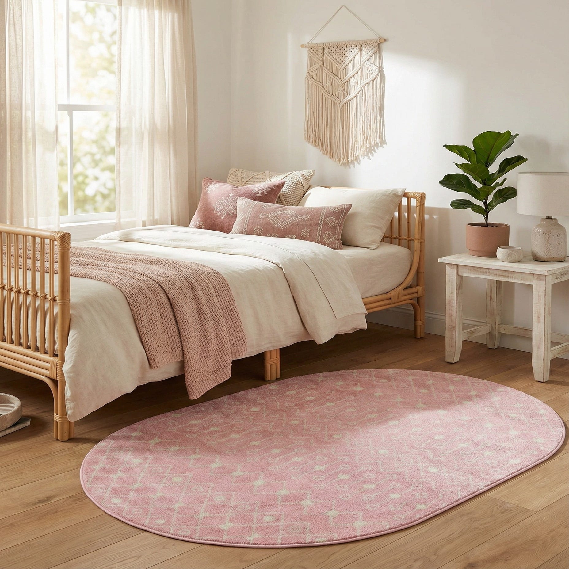 A soft, oval rug in a warm pink ground with an ivory trellis motif laid out in horizontal bands. The design mixes small diamond lattices with rows of elongated dotted lines and tiny medallions for a measured, geometric look that still feels gentle. The ivory pattern sits slightly raised against the pink, creating subtle depth and a light, airy contrast that keeps the overall impression fresh and inviting.