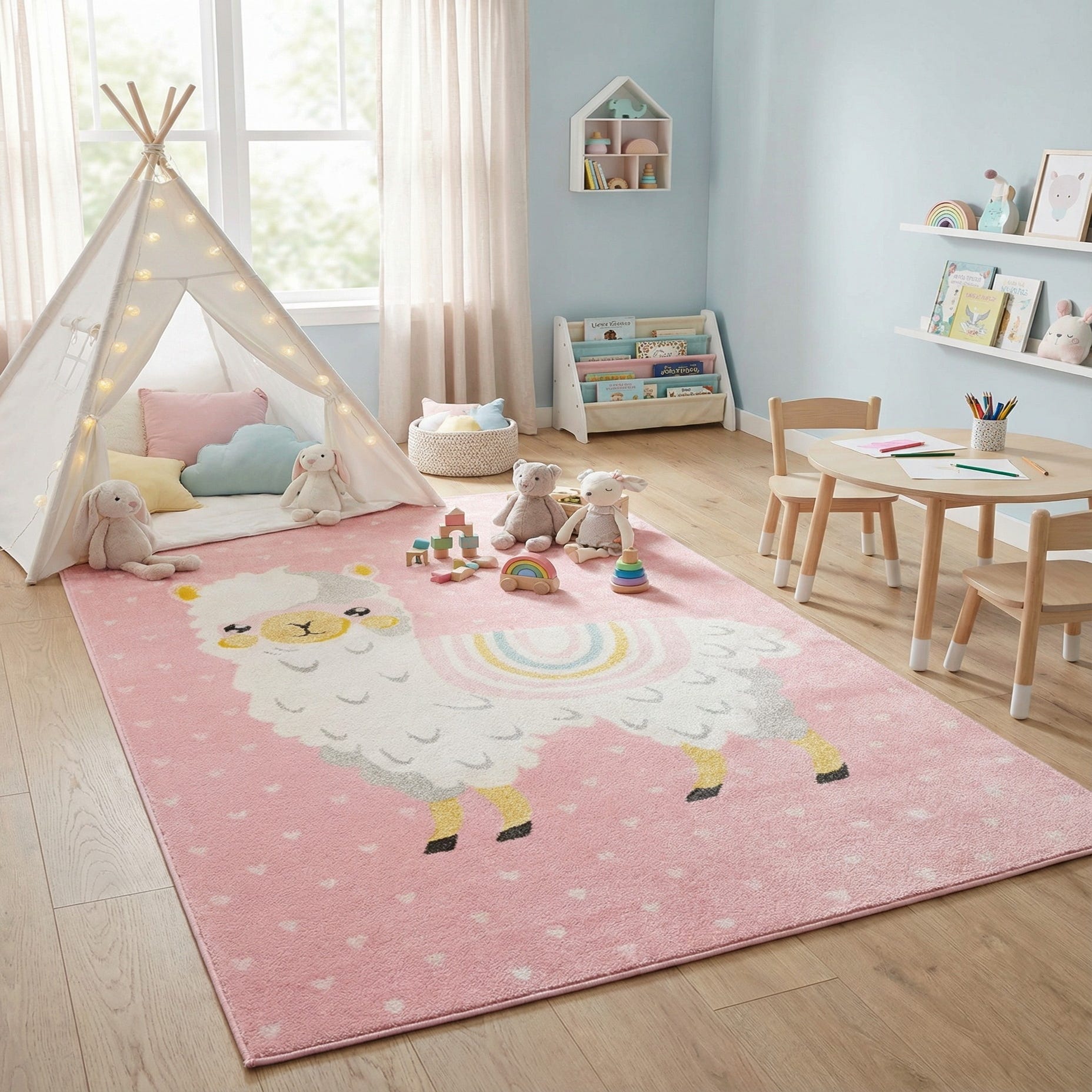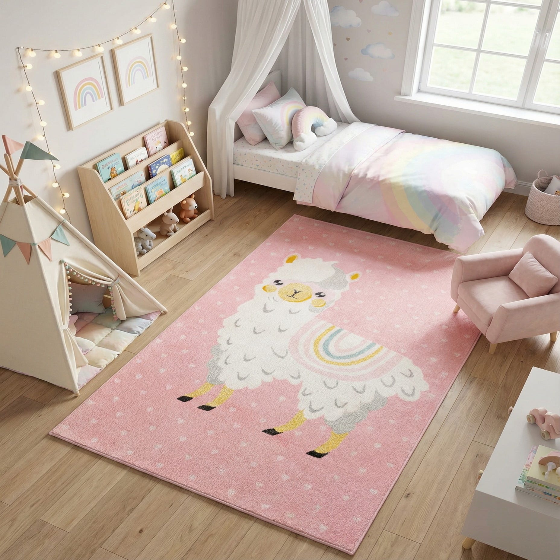 A 5x8 rectangular pink rug featuring a cute white llama with a rainbow blanket, surrounded by small white hearts.