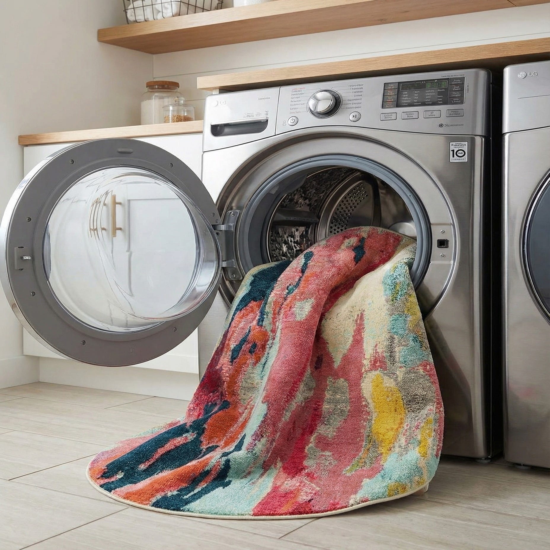 Place this round rug to anchor a seating area, bring color to a neutral living room, or add energy to a playroom or creative studio. It pairs well with light wood furnishings and brass or matte black accents, and balances both mid-century and contemporary interiors—try it under a round table, beneath a lounge chair and ottoman, or layered with a natural fiber rug for an eclectic feel.
