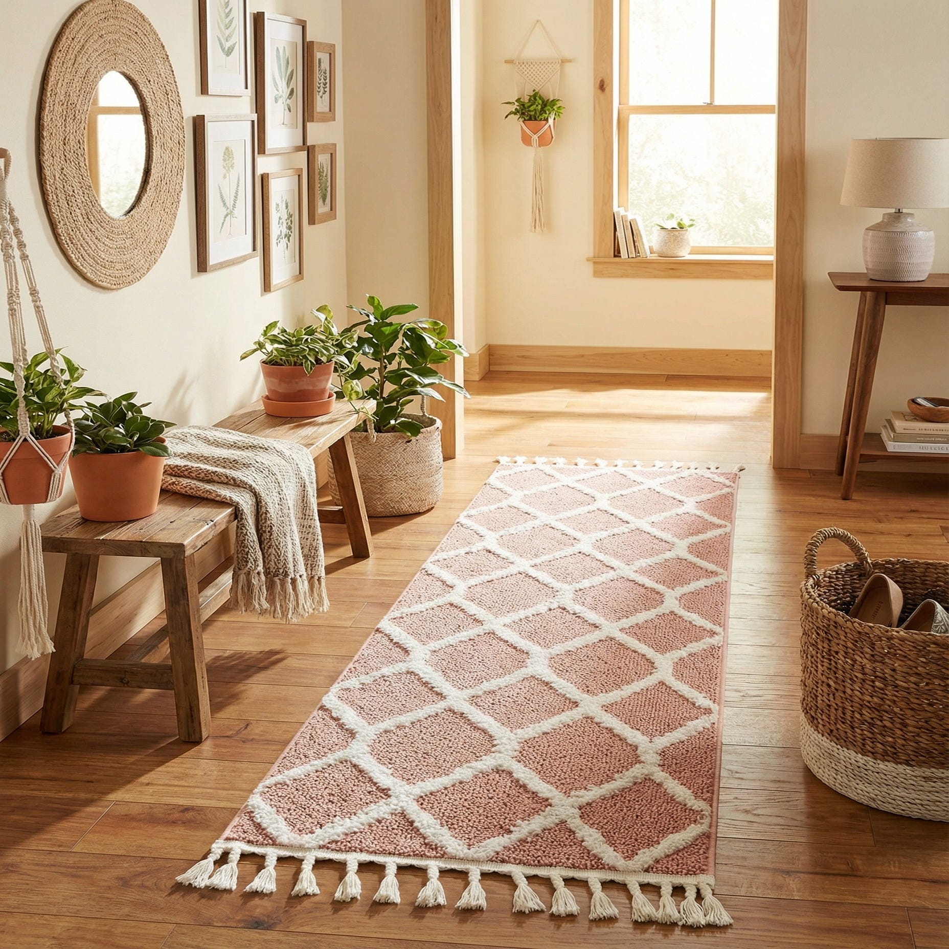 A 6 ft runner rug with a modern pink and white trellis pattern, featuring a textured pile and white tassels.