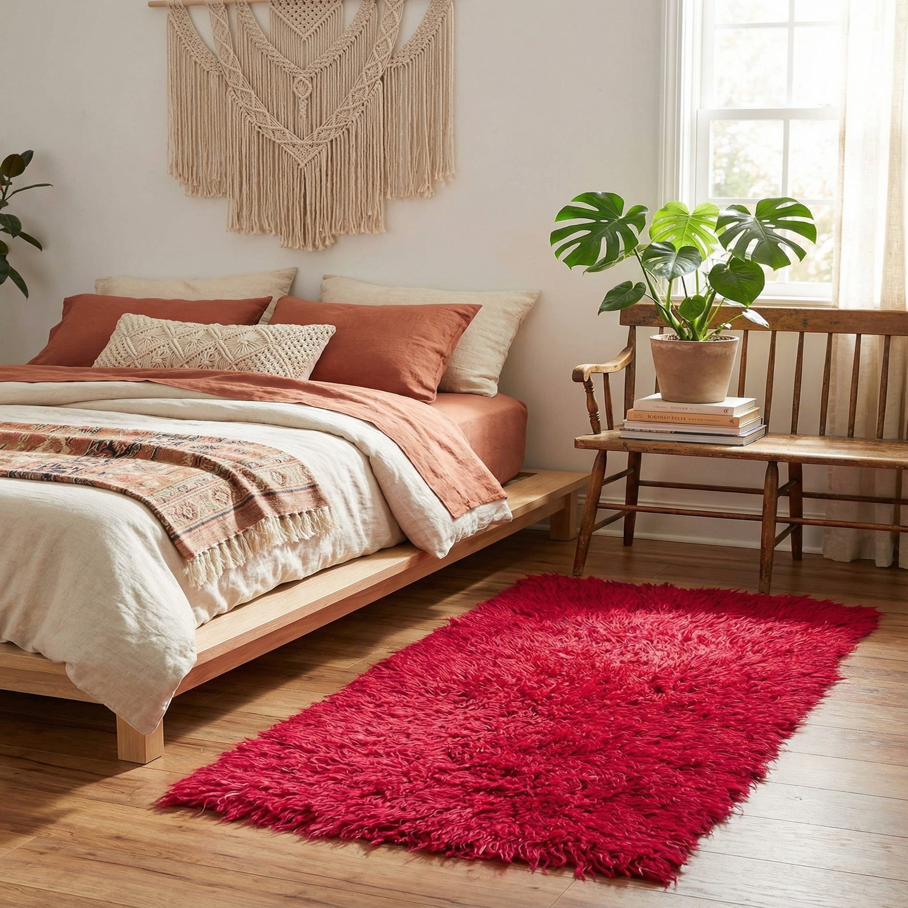 This runner could serve as a dynamic accent in modern, bohemian, or eclectic decor settings. Its vivid color and plush texture make it especially suitable for adding warmth and vibrancy to entryways, hallways, or alongside a bed in a bedroom setting. The runner's linear form complements long, narrow spaces and can create a sense of direction and flow in a room.