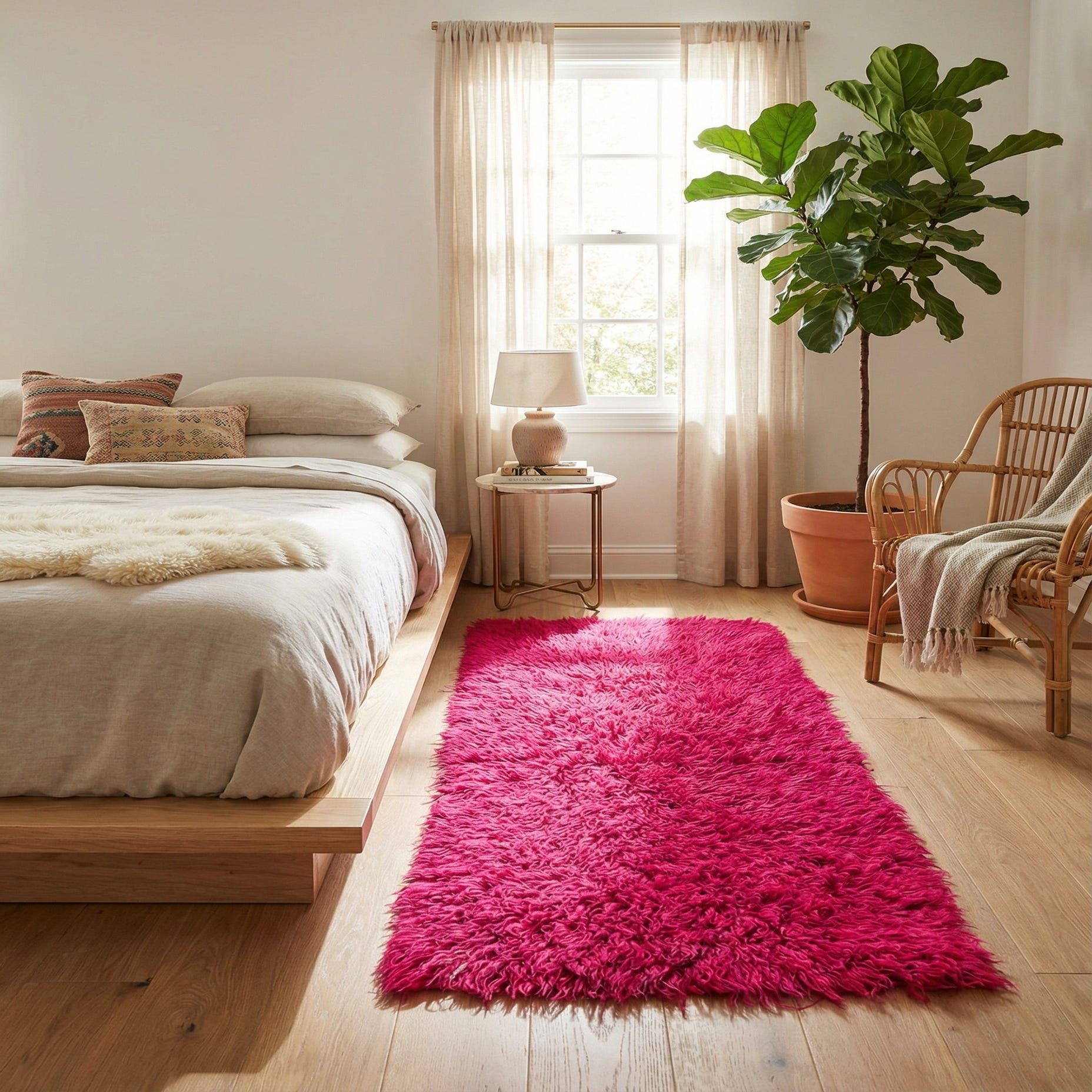 A vibrant pink 6 ft runner rug with a plush, shaggy texture, perfect for adding a pop of color to a hallway.