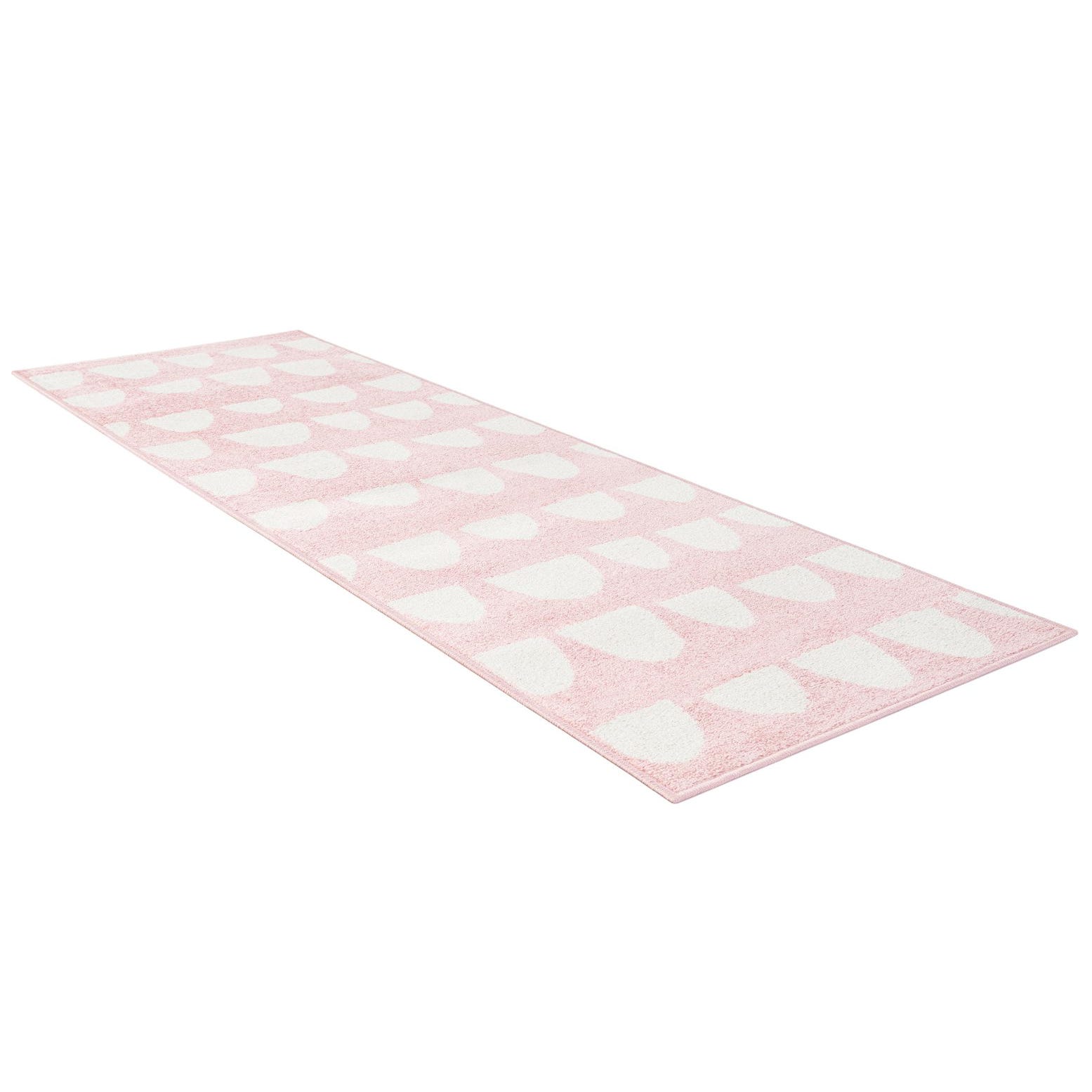 A 6 ft runner rug from the Whimsy Kids collection, featuring a modern abstract pattern of white half-circles on a soft pink background.