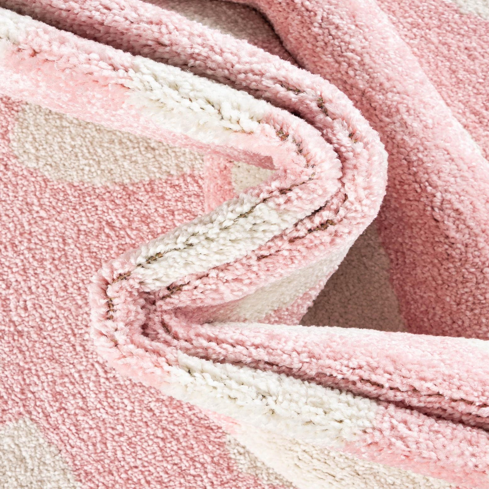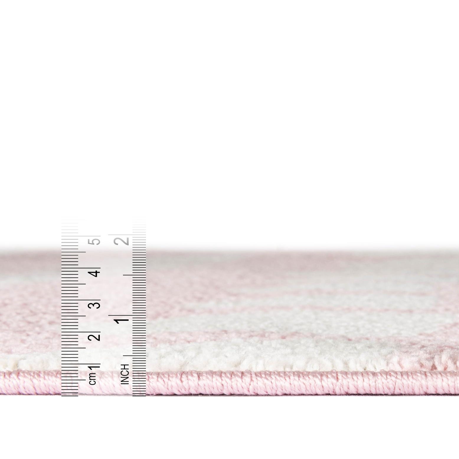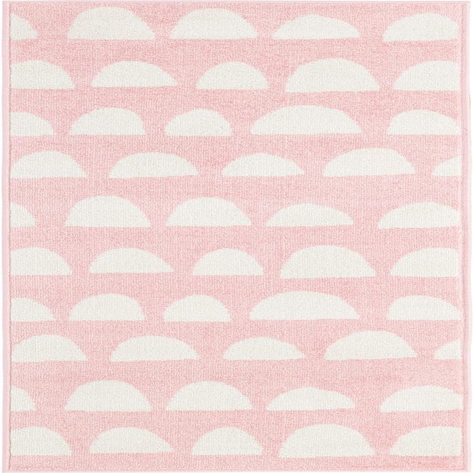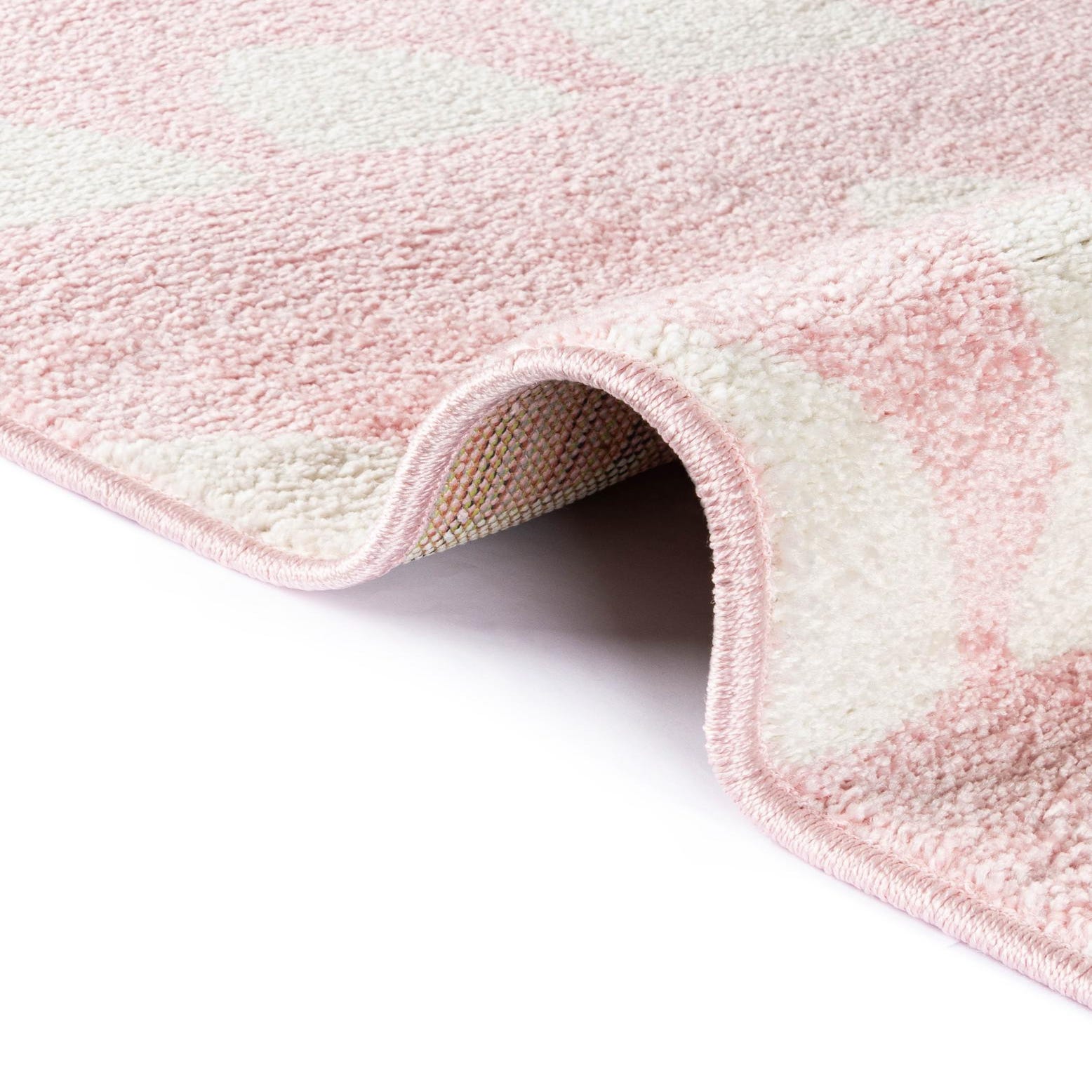 A 6 ft runner rug from the Whimsy Kids collection, featuring a modern abstract pattern of white half-circles on a soft pink background.