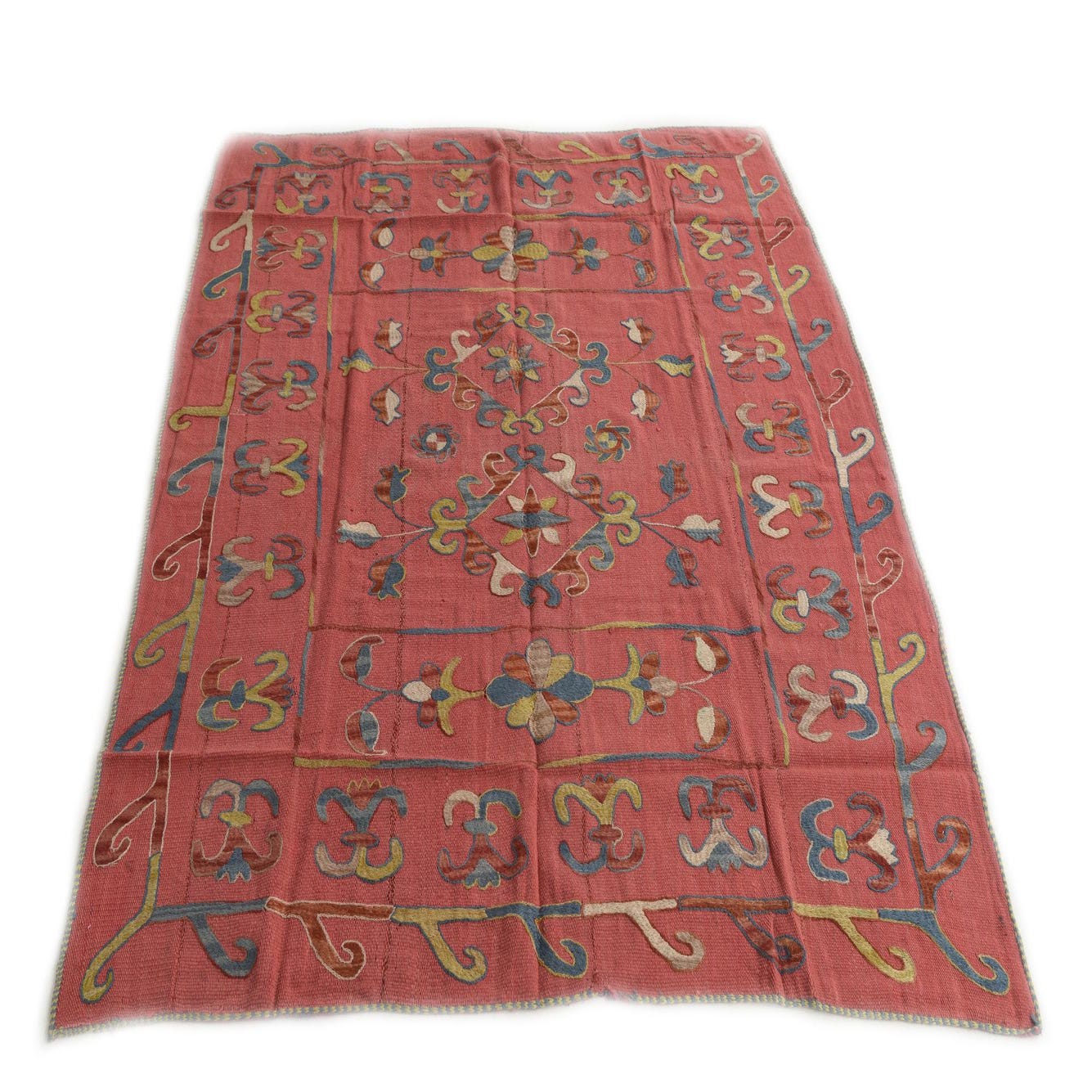 A 5' 3 x 6' 2 square pink Kilim Suzani rug with a tribal, oriental pattern in blue, yellow, and brown.
