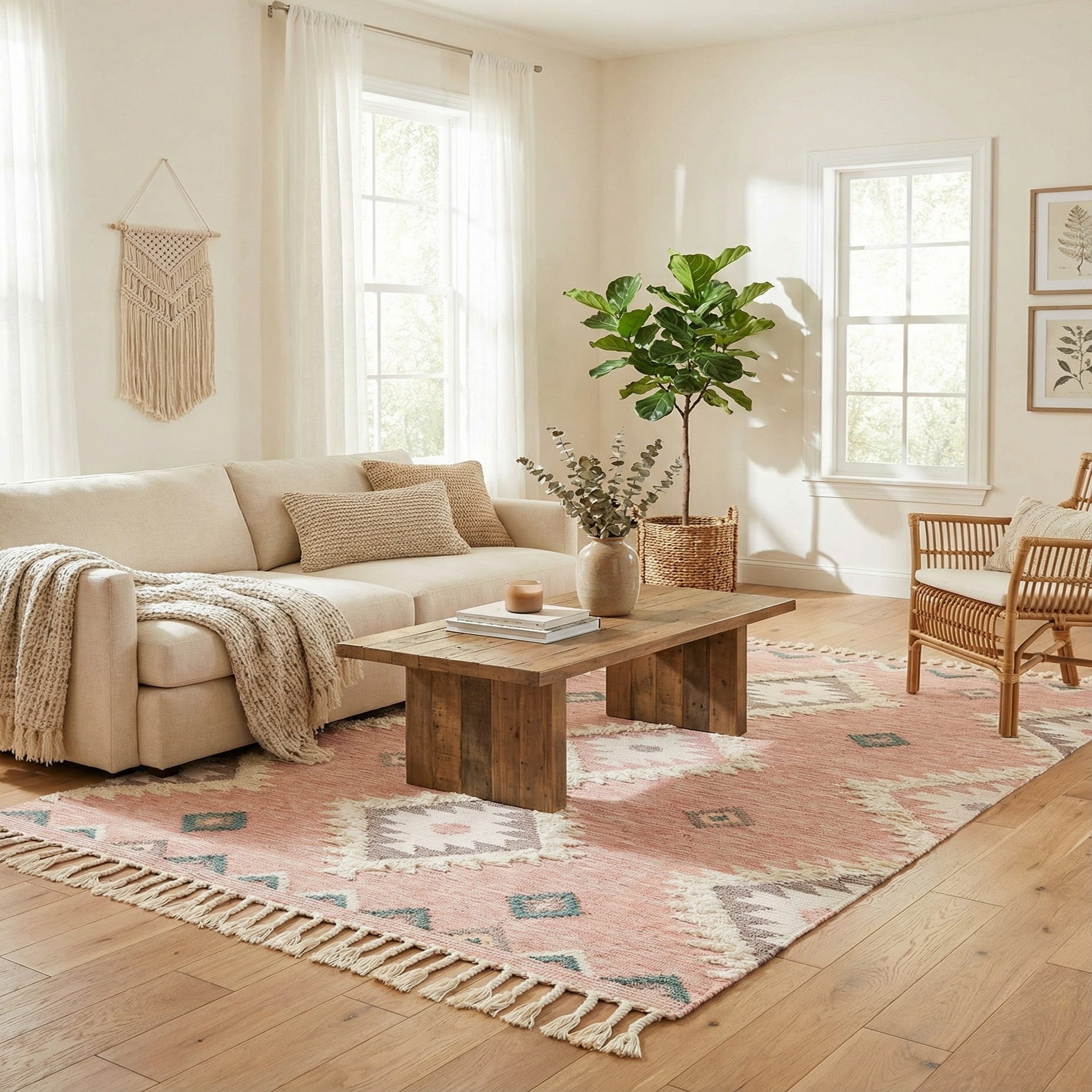 A 6x9 rectangular pink wool rug with a bohemian tribal pattern featuring large white and gray diamonds, small teal diamonds, and fringed edges.