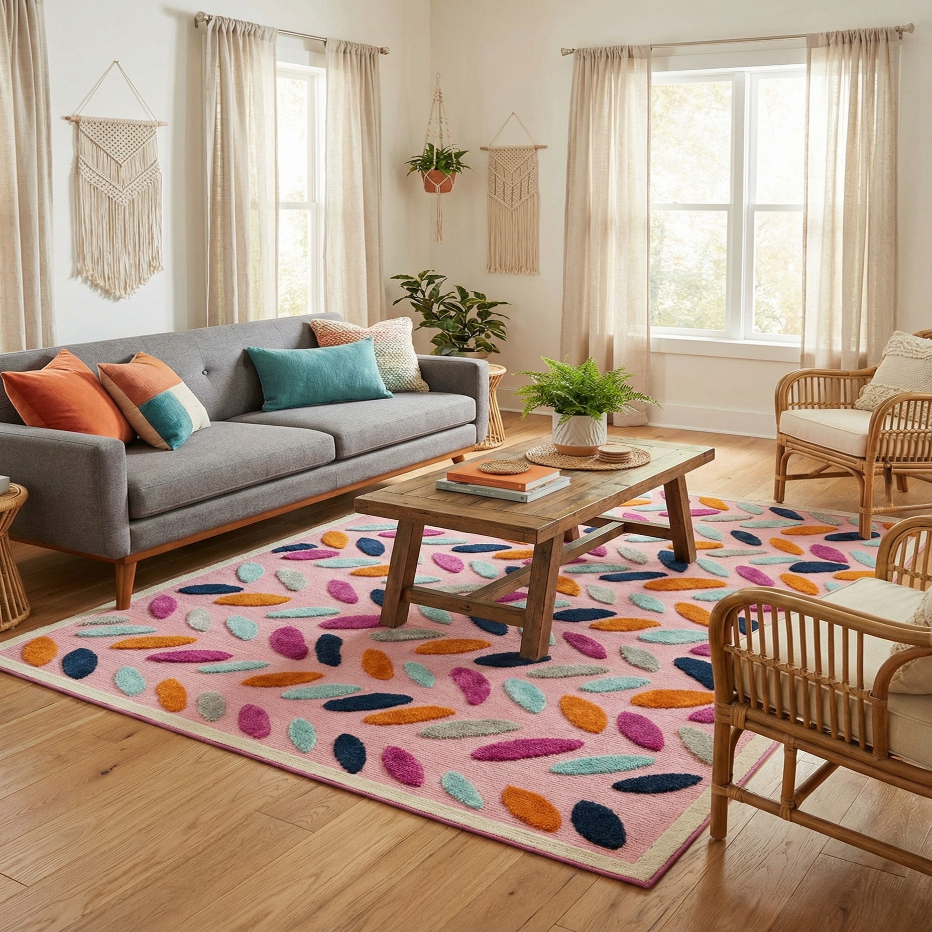 A 6x9 rectangular pink rug with a vibrant bohemian pattern of colorful leaf-like shapes in teal, orange, navy, gray, and fuchsia.