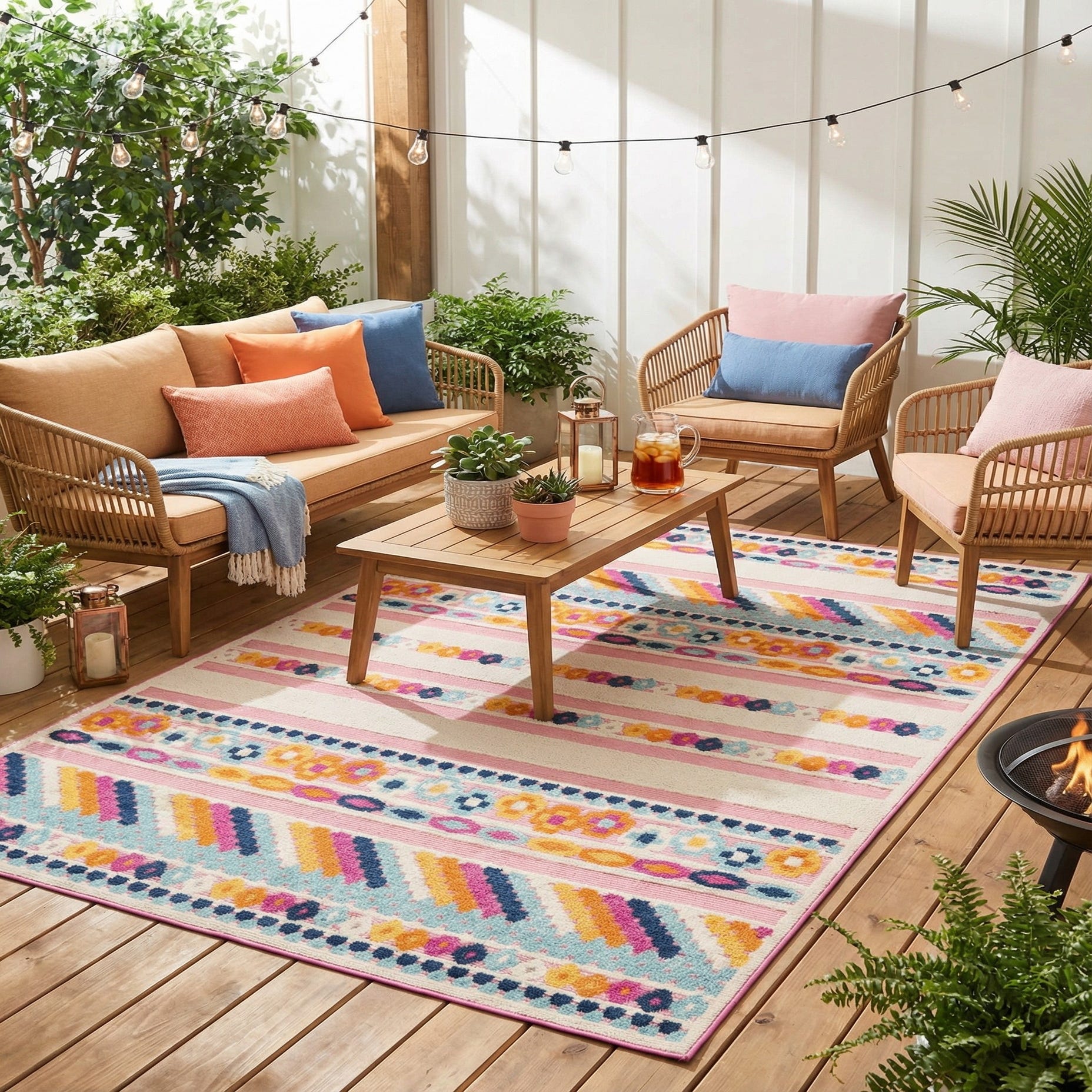 A 6x9 rectangular rug featuring bohemian stripes in pink, blue, orange, and yellow on a cream background, suitable for indoor or outdoor use.