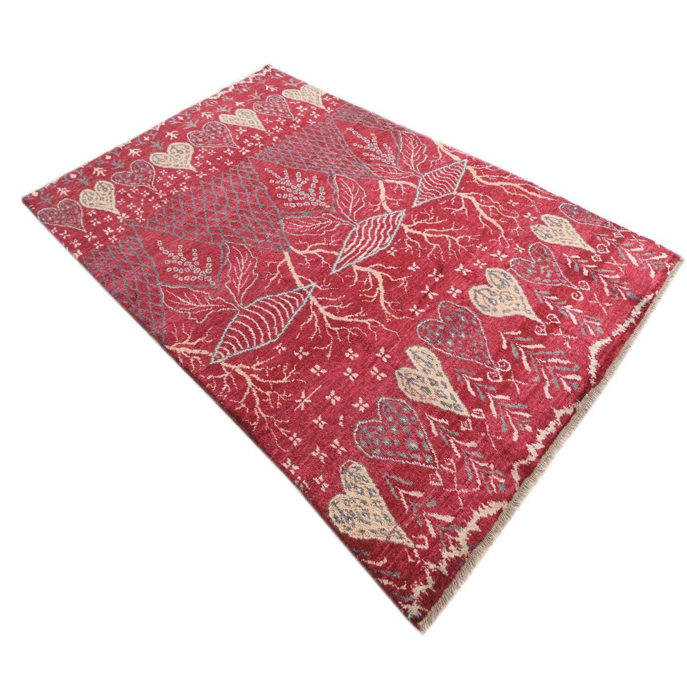 A 6x9 rectangular Balouch rug with a tribal, modern, and abstract pattern in shades of pink, grey, and beige, featuring hearts, leaves, and root-like motifs.