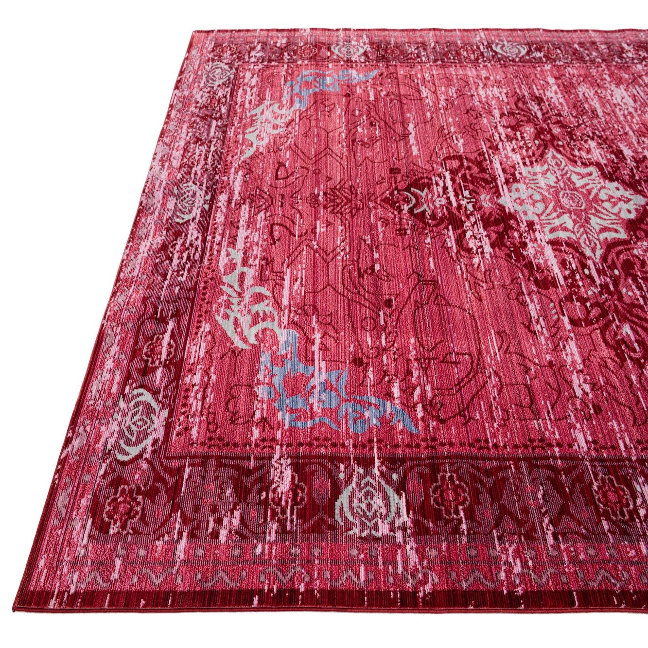 A 6x9 rectangular pink area rug with a distressed modern oriental medallion pattern in various shades of pink and light blue accents.