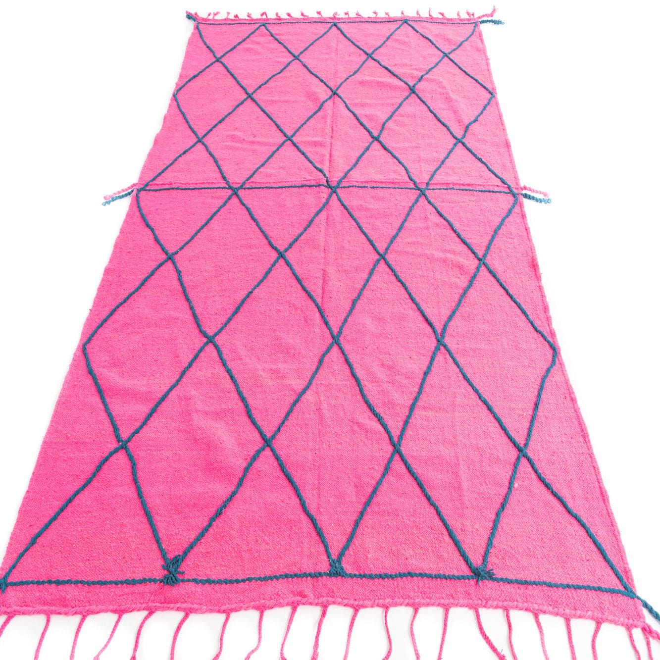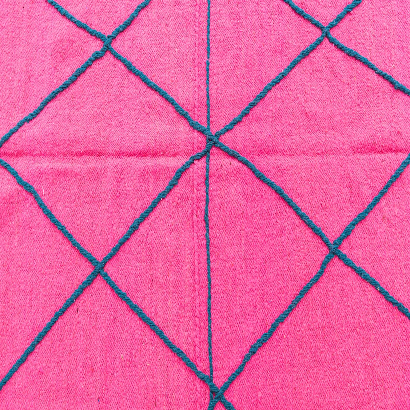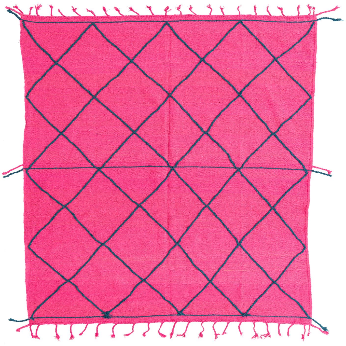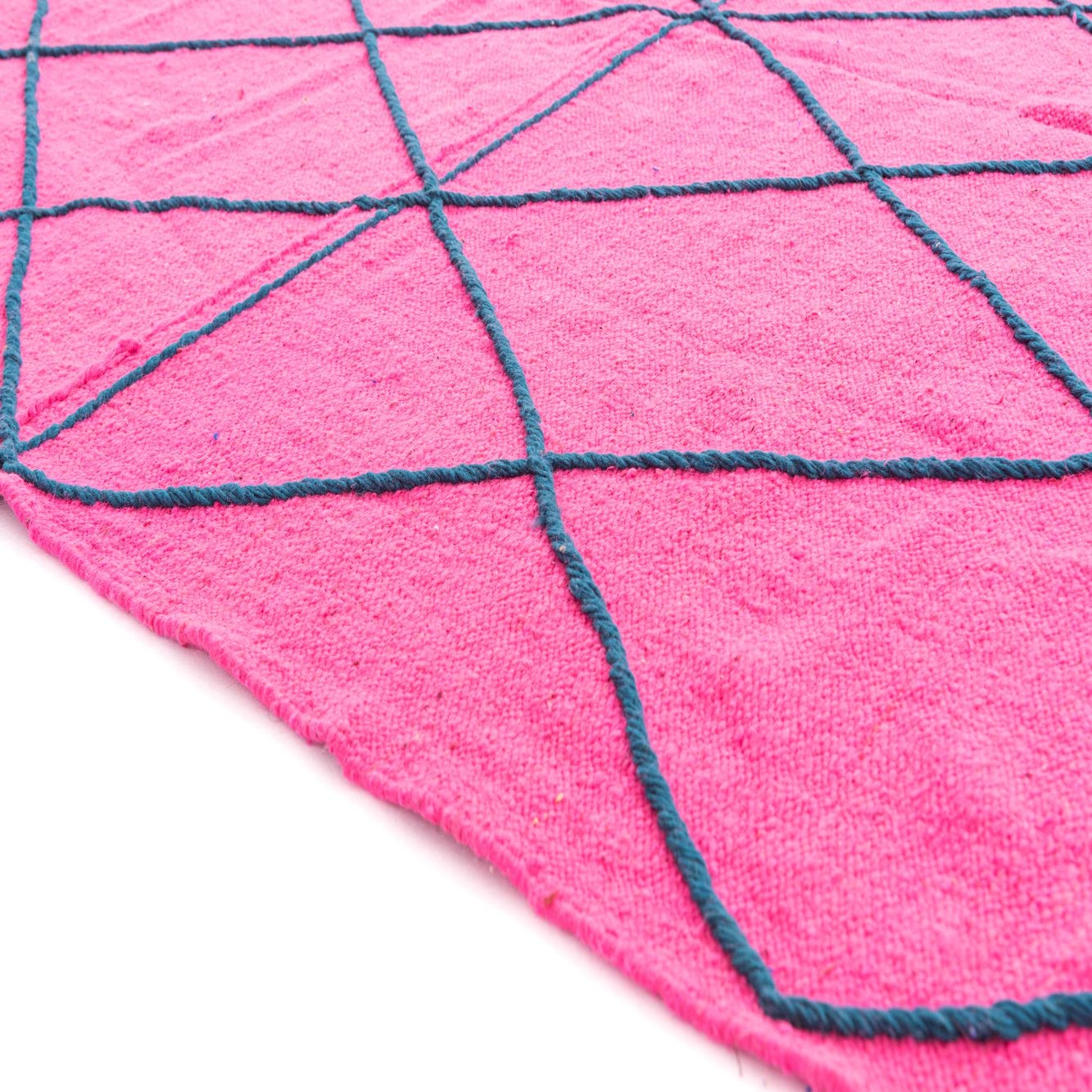 This Moroccan collection rug, sized at a versatile 6x9, is a testament to craftsmanship and cultural heritage. Hand-knotted from 100% wool, the rug showcases a strikingly bold pink background punctuated by geometric diamond motifs in deep navy blue. Its texture offers a tangible sense of coziness and warmth that only pure wool can provide.