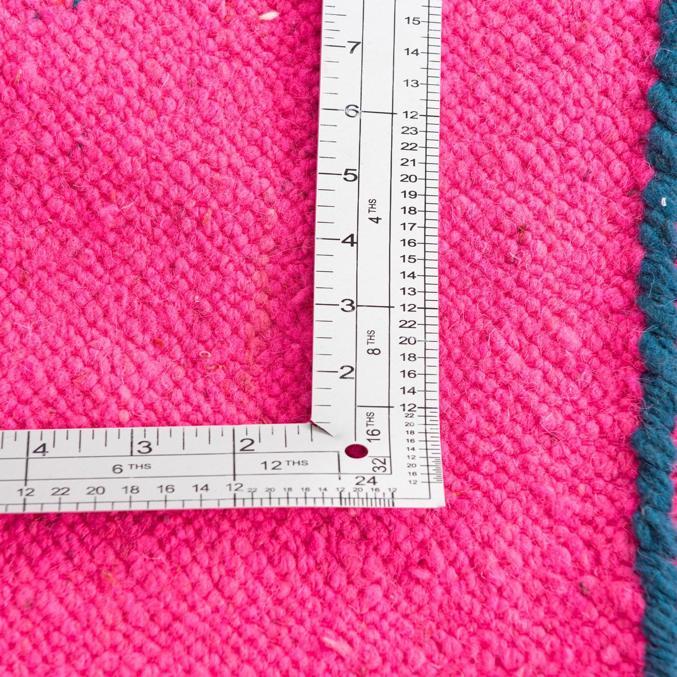 A vibrant 6x9 rectangular pink shag rug with a dark teal diamond tribal pattern and fringe edges.