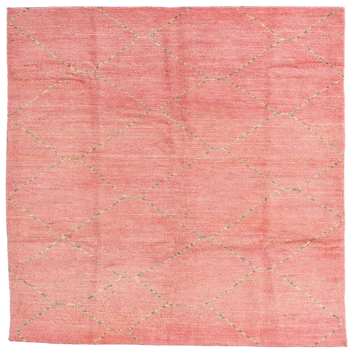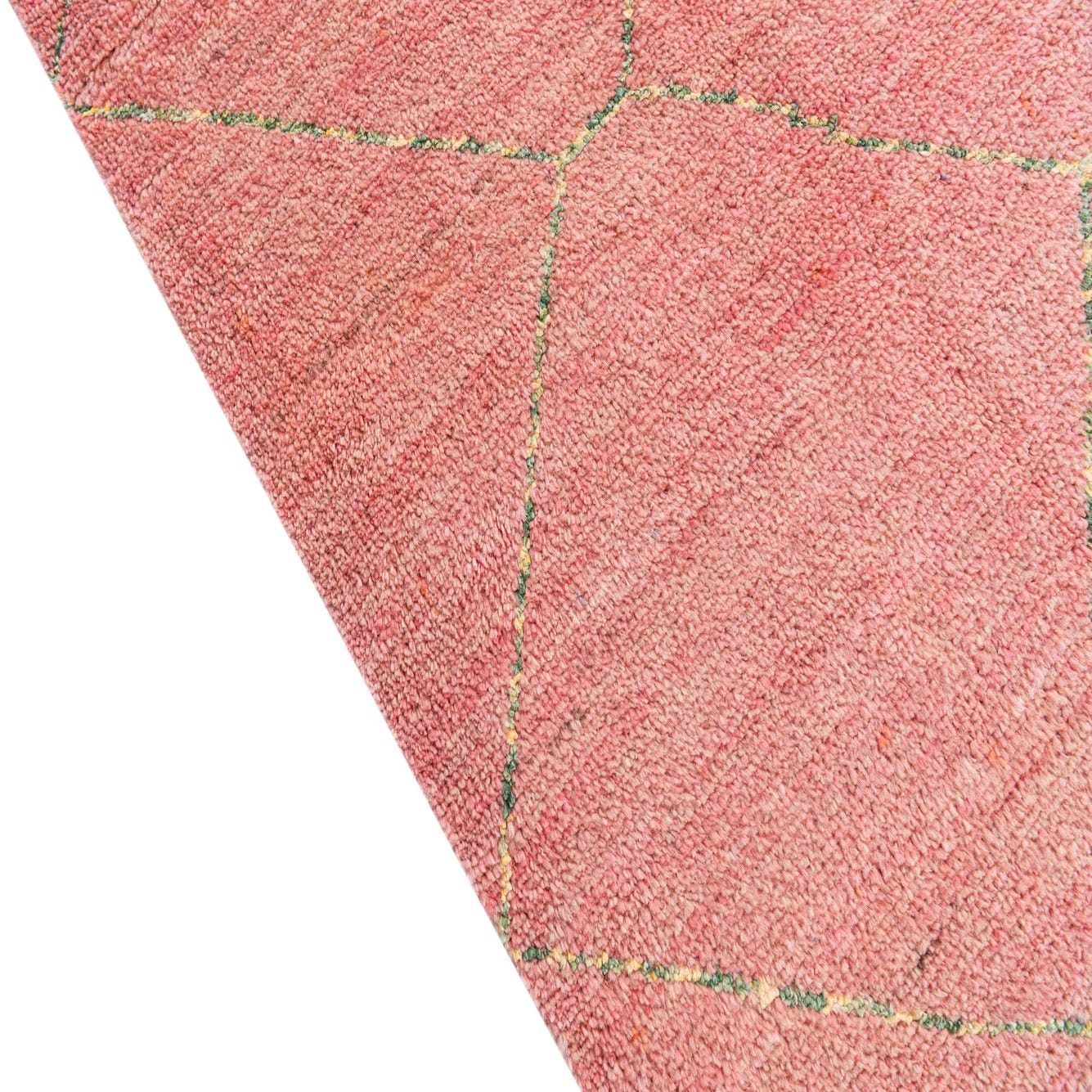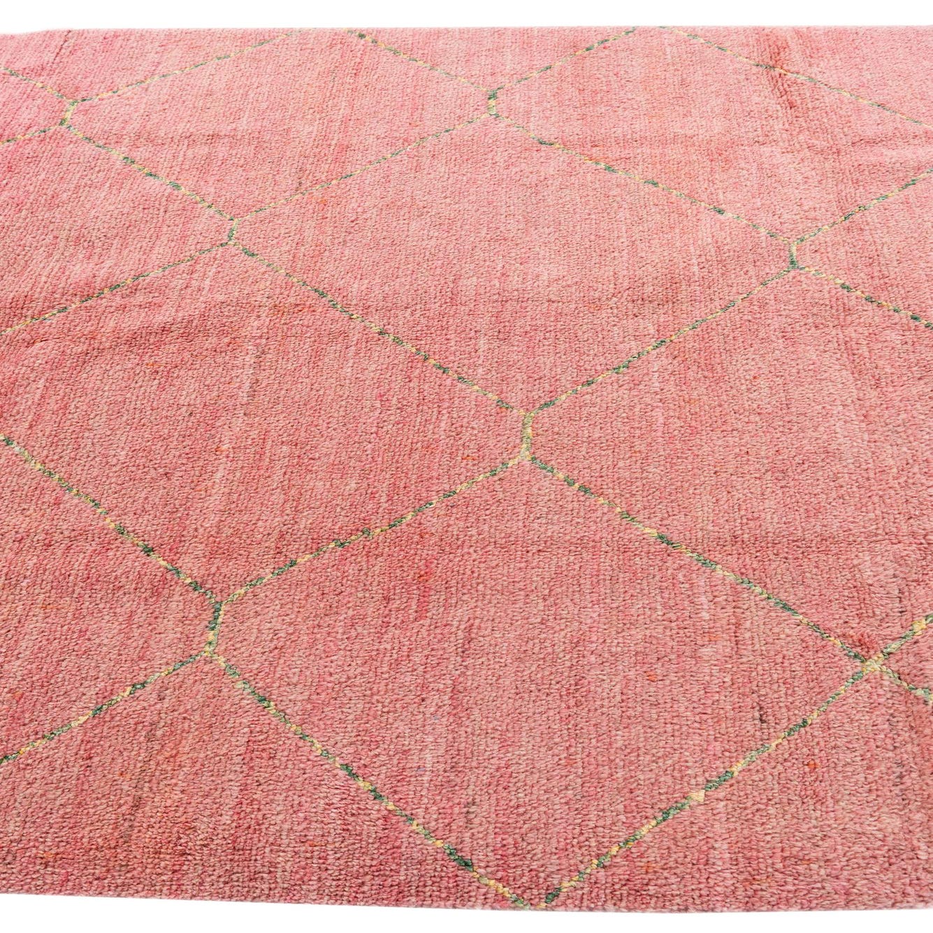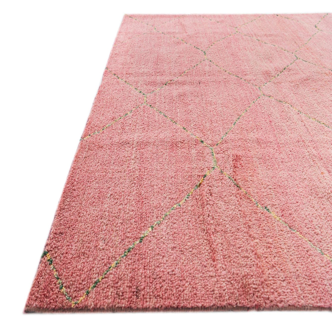 This Moroccan collection 6x9 rug is hand knotted from 100% wool, providing a sense of comfort and warmth to any living space. The primary pink background is complemented by a lattice pattern featuring lines in subtle shades of gray, green, yellow, and black. The textural quality of the wool lends depth to the simple geometric design, which is a hallmark of Moroccan-inspired decor.