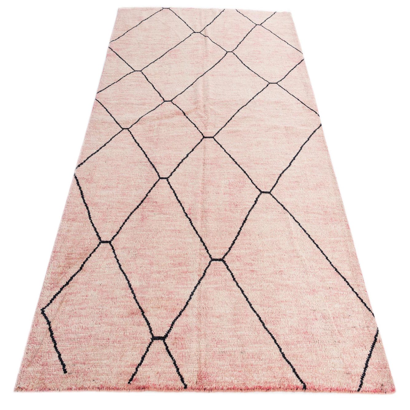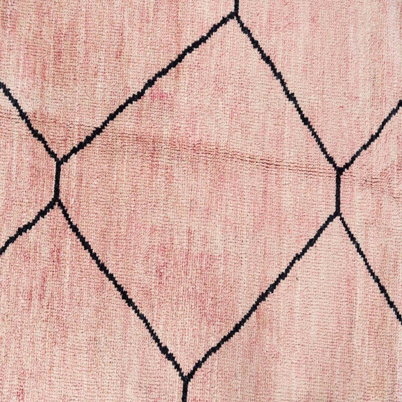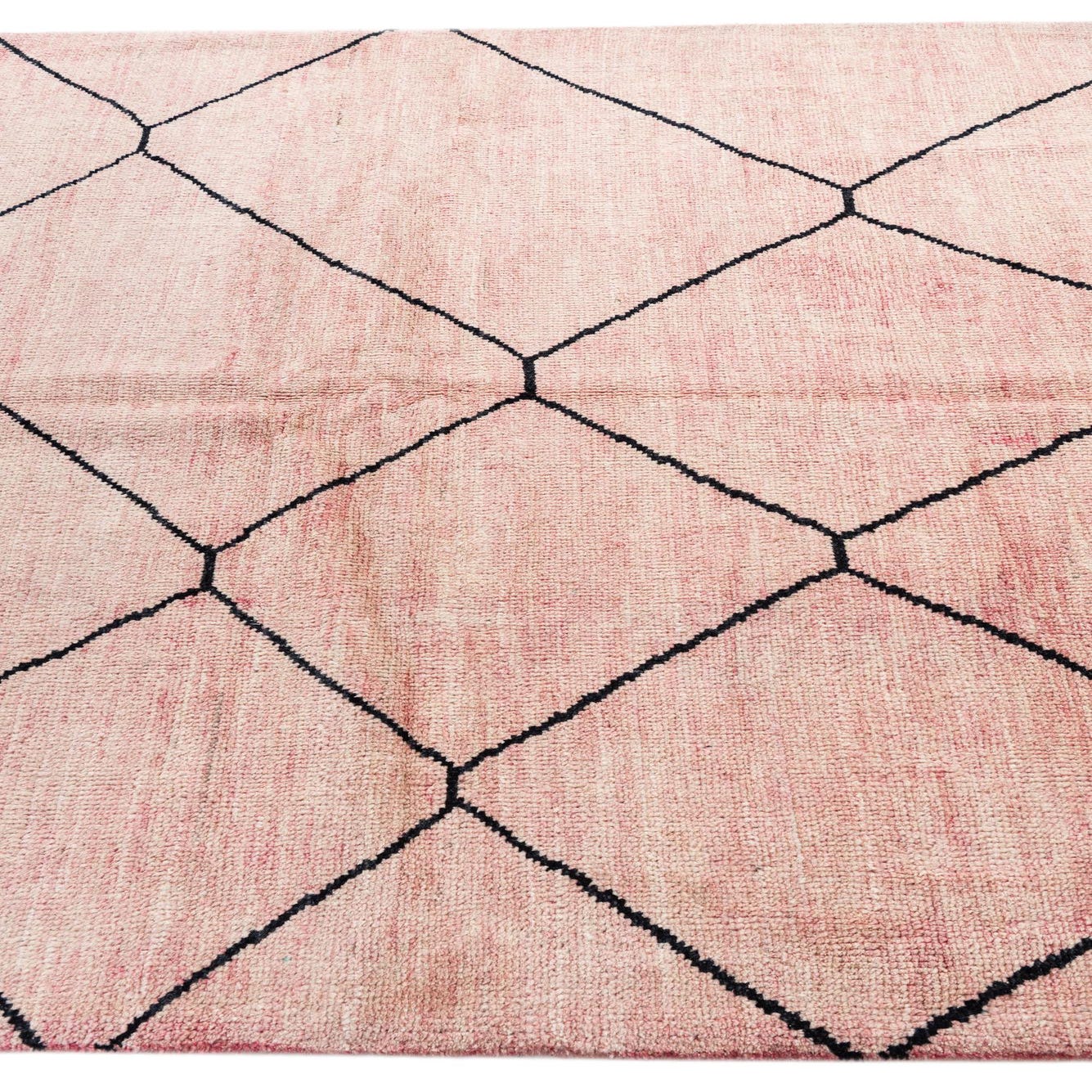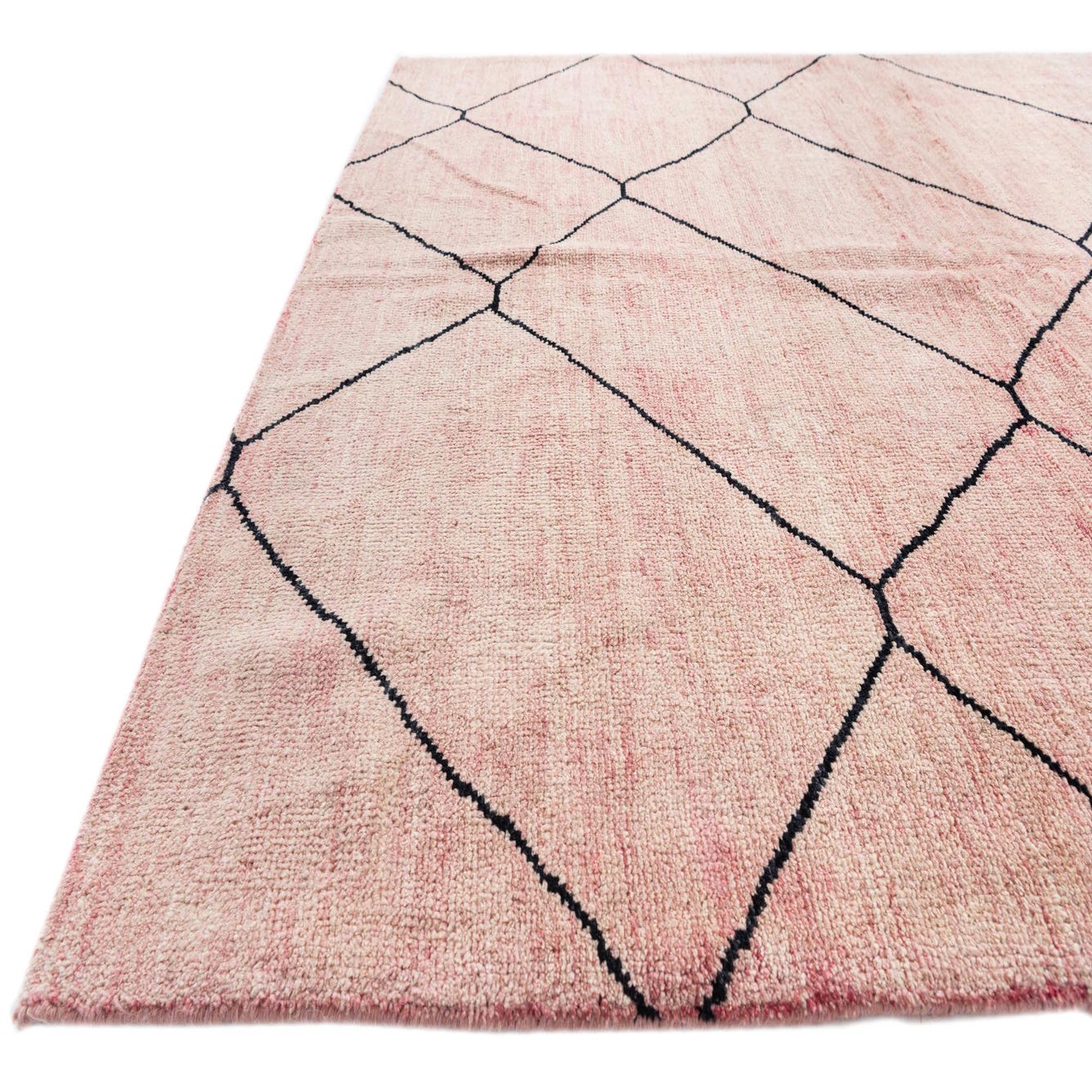 This hand-knotted Moroccan collection rug brings a touch of understated elegance to any space with its simple geometric pattern. Crafted from 100% wool, this 6x9 rug features a soft pink background contrasted by bold, angular lines in black, with touches of ivory that add depth to the design.