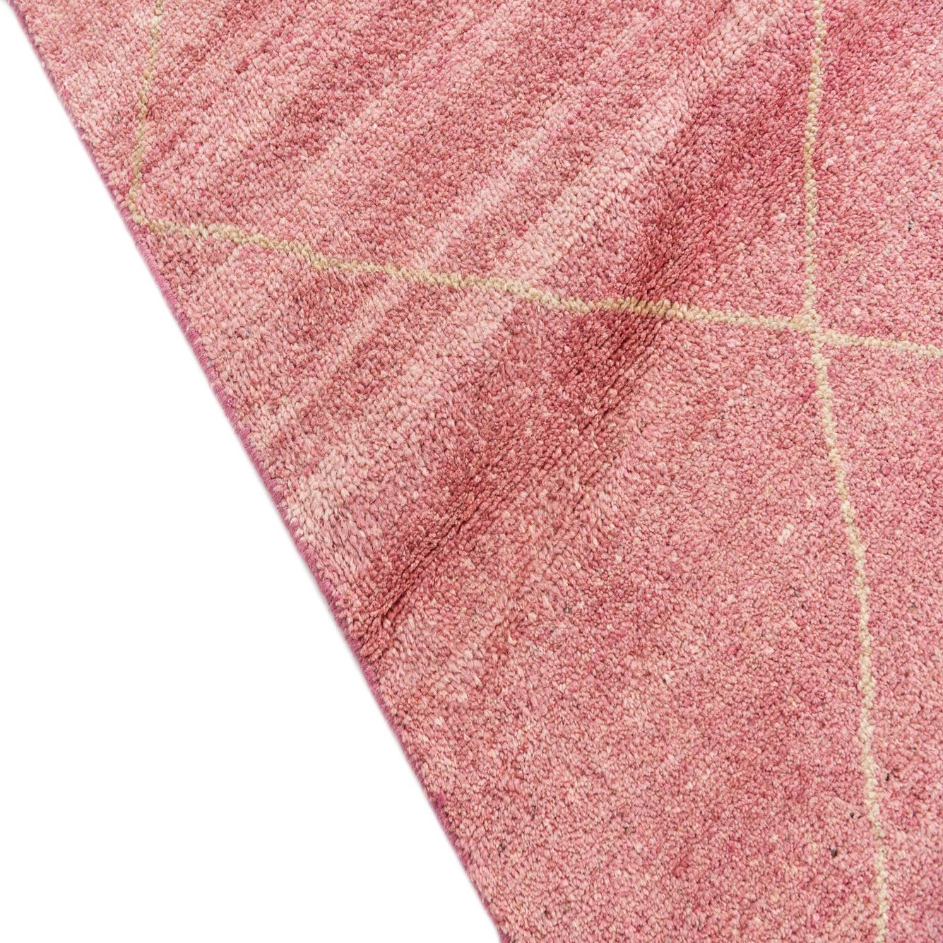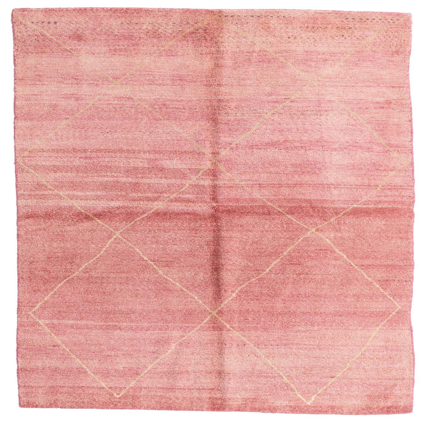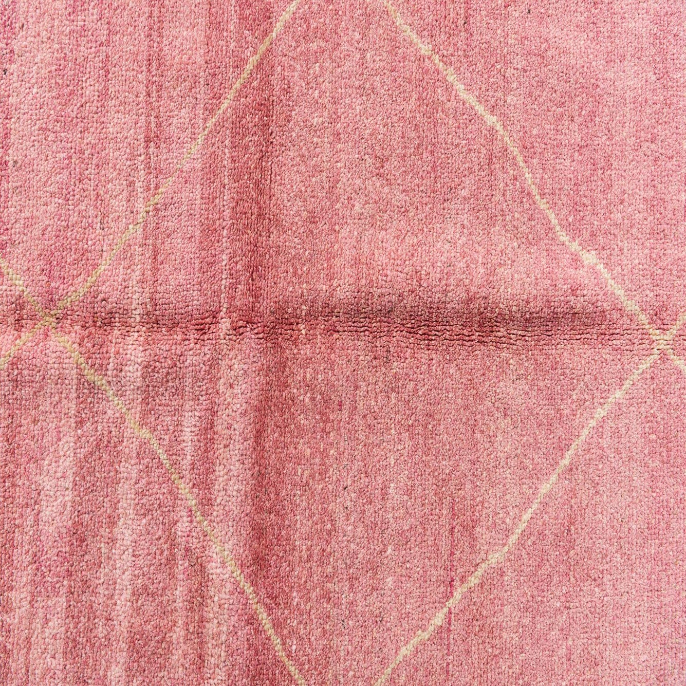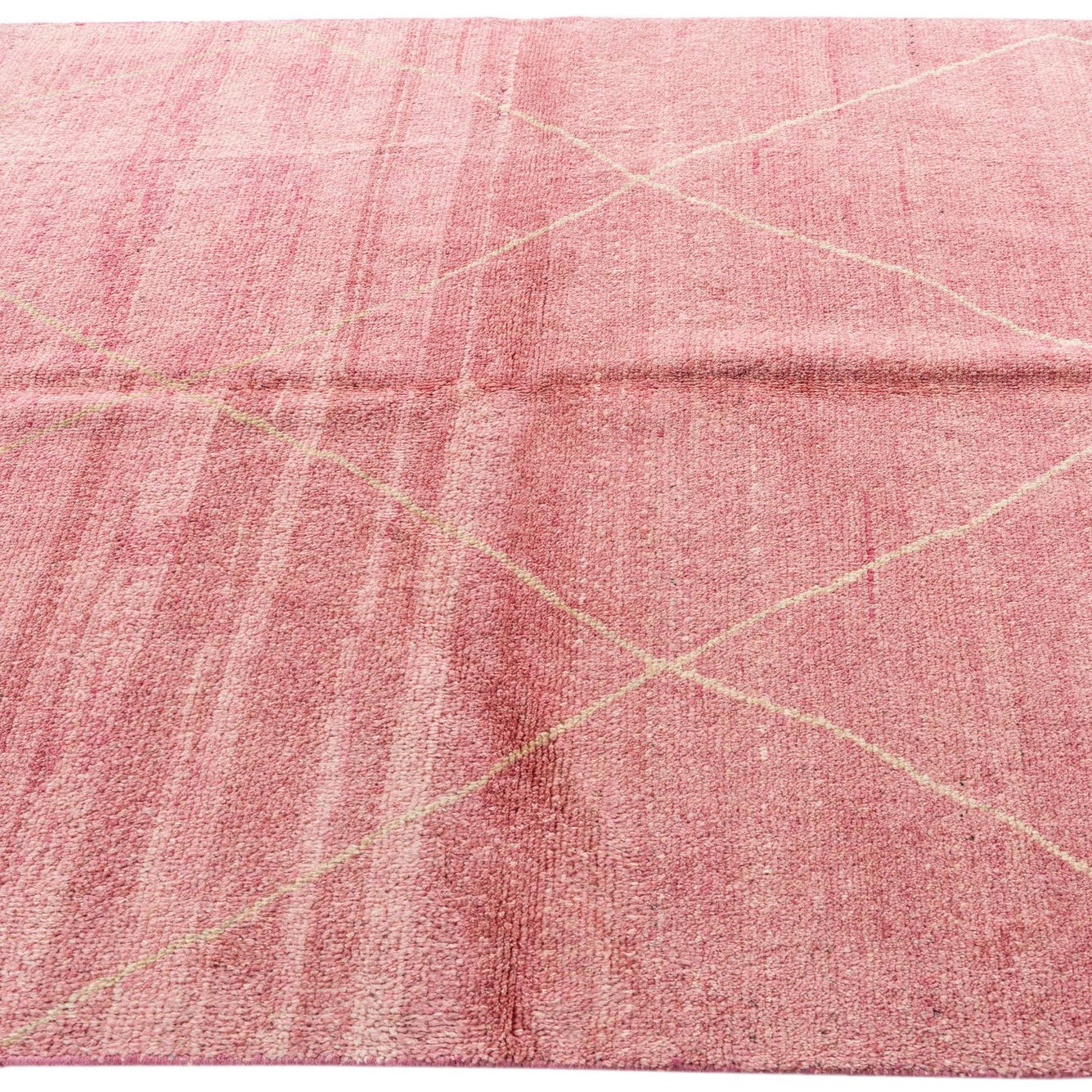A 6x9 rectangular pink shag rug with a subtle cream diamond pattern, ideal for a living room.
