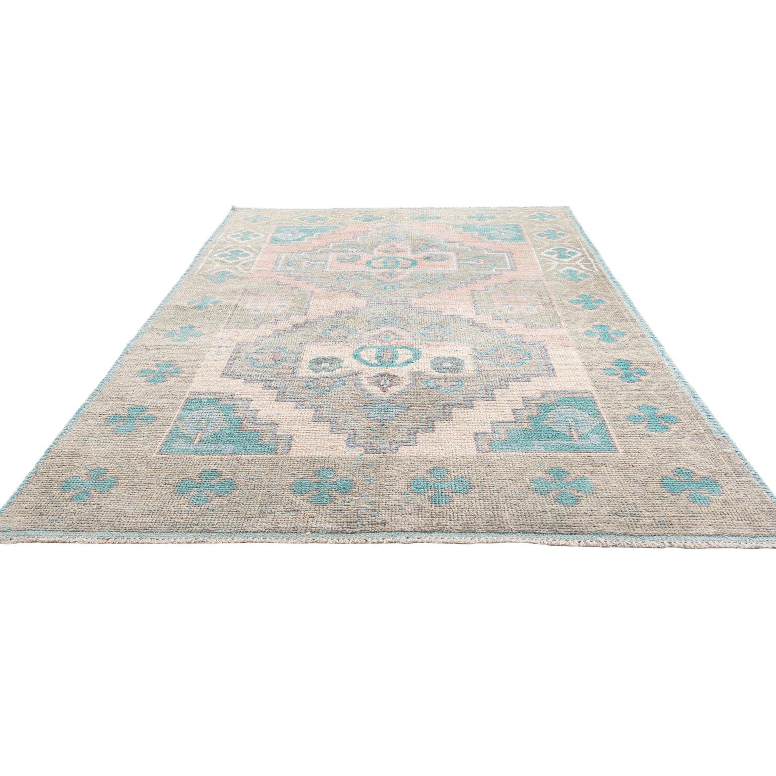 Hand-knotted of 100% wool, the surface has a tactile, slightly uneven texture from the knotting that feels warm and substantial underfoot. The wool pile offers gentle depth to the colors, with the ivory and gray grounding the palette while the turquoise provides fresh contrast. Place this piece beneath a low-profile sofa or a wood-framed bed to soften a living room or bedroom, use it to add color and pattern to a nursery or dressing area, or layer it over natural-fiber flooring in a coastal, bohemian, or modern farmhouse setting.