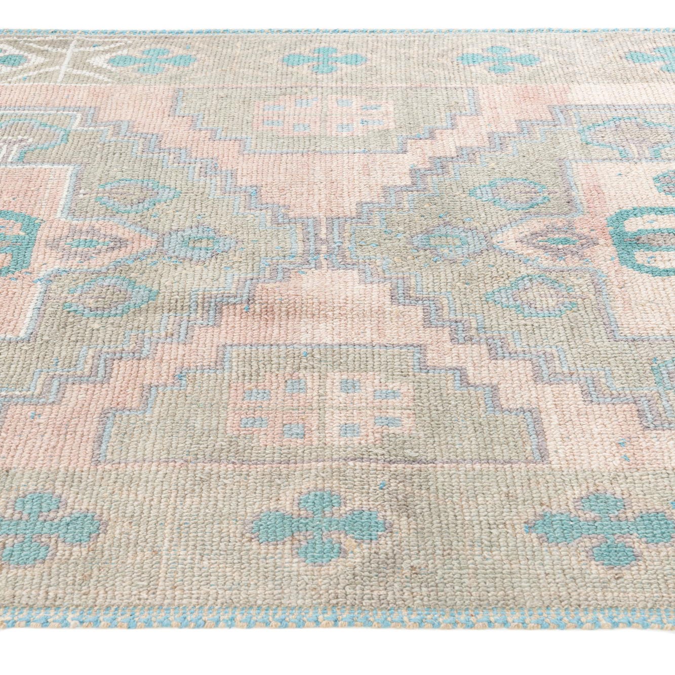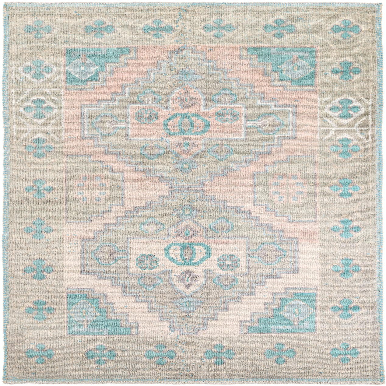 A soft pink field forms the backdrop for a bold, stepped medallion and repeating geometric motifs in gray, ivory and turquoise. The central diamond medallion is mirrored top and bottom, surrounded by stylized floral and teardrop accents and corner spandrels in turquoise. An outer border of small quatrefoil-like motifs frames the design, giving the rug a balanced, vintage-inspired look with clear, graphic lines.
