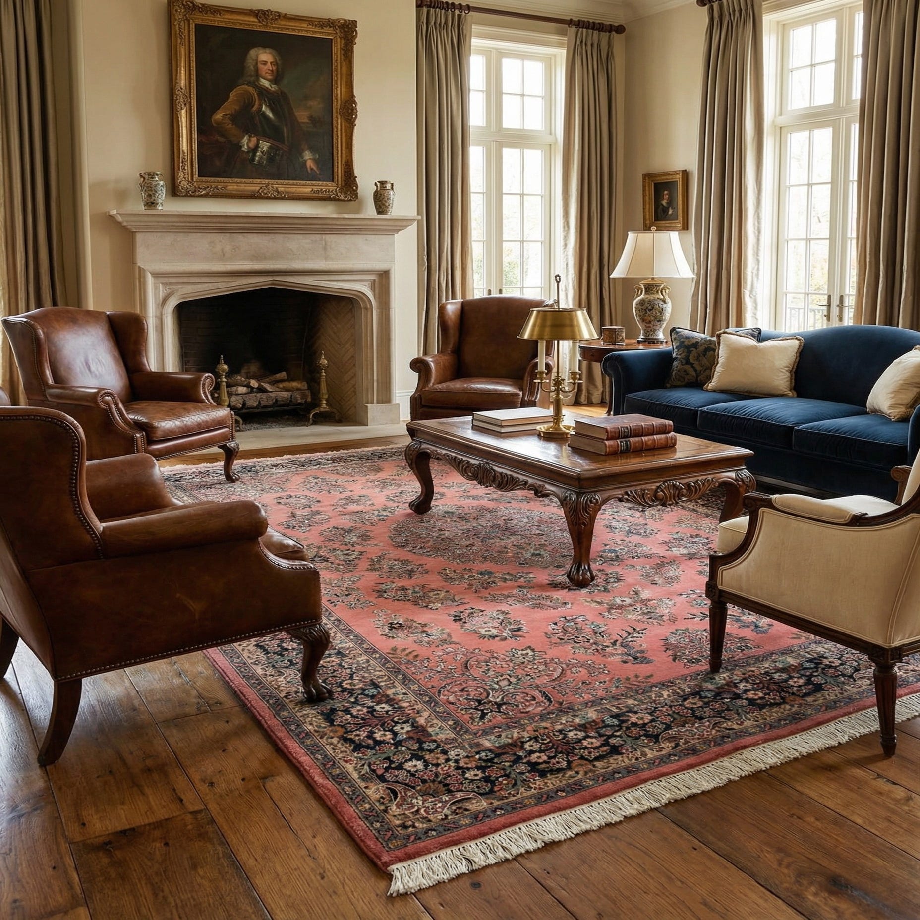 A 6x9 rectangular Sarouk wool rug in shades of pink, featuring a detailed floral pattern and dark border.