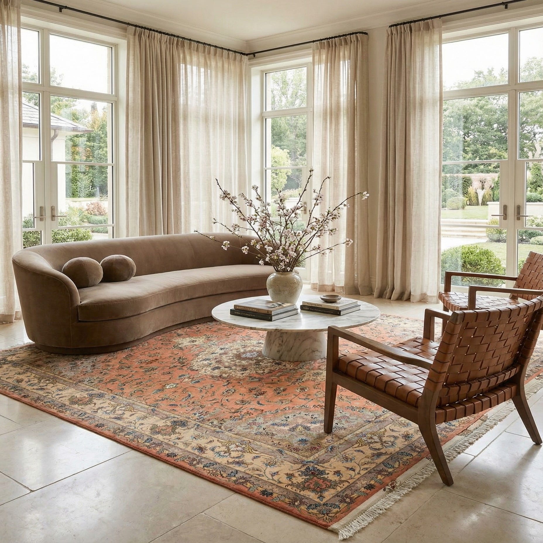 Its color palette radiates warmth and versatility, with shades of pink forming the background, complemented by light brown, beige, grey, cream, olive, and blue accents. The combination of these colors imbues a sense of harmony and can effortlessly complement a range of interior designs.