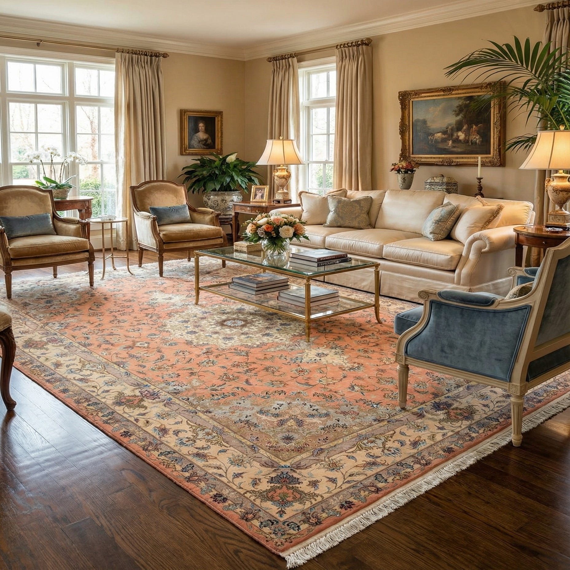 The rug's texture is rich and inviting, attributed to the combined use of wool and silk, materials known for their durability and soft touch. This piece would seamlessly integrate into classic, traditional spaces, or serve as a sophisticated accent in more modern settings, providing a focal point that ties together furniture and accessories with its array of complementary tones.