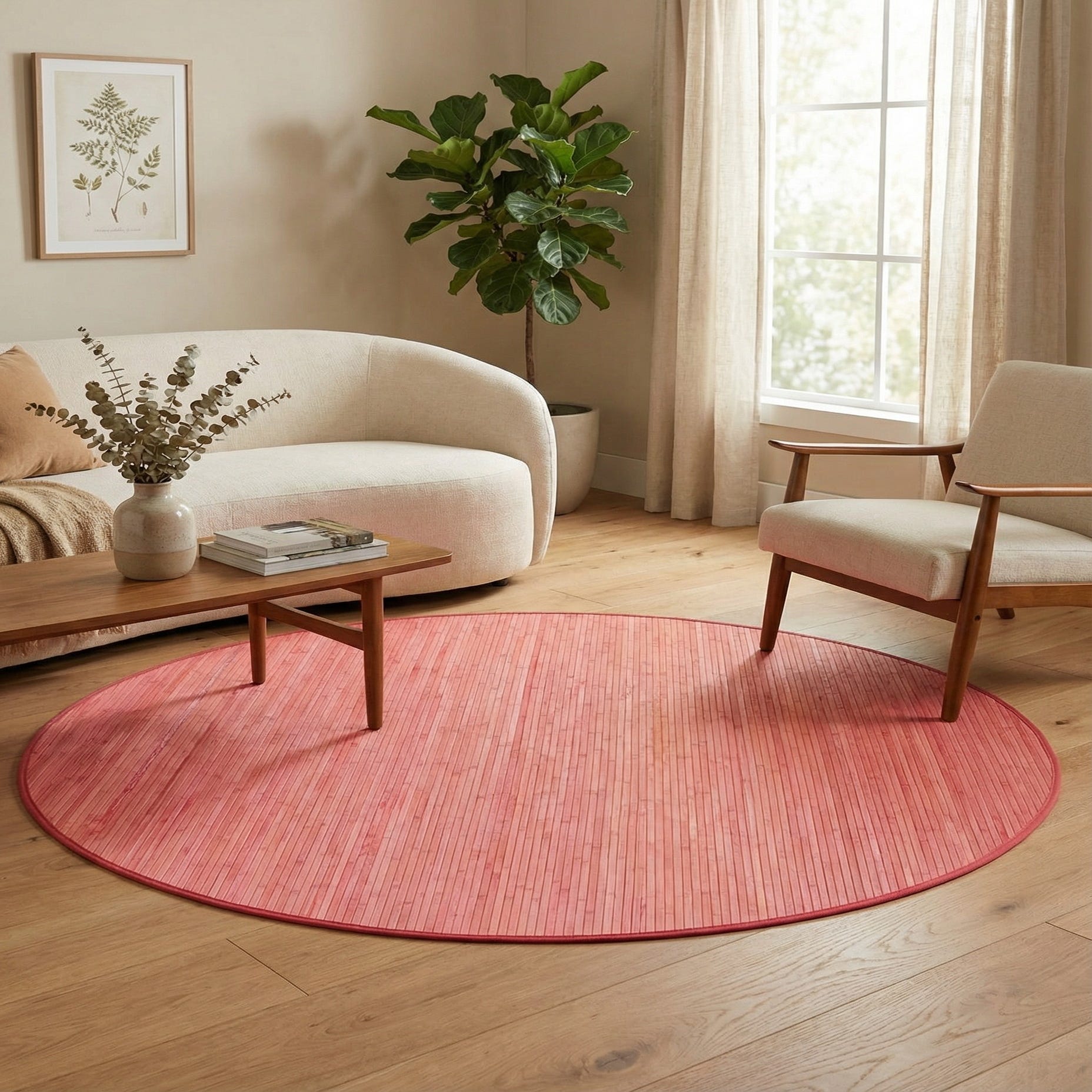 Machine-made from 100% bamboo, this round rug presents a linear, slat-like pattern in tonal pinks that reads clean and contemporary. The surface is low-profile and smooth with the natural grain and subtle variations of bamboo creating gentle streaks and knots for visual interest. A slightly deeper-pink binding frames the edge and reinforces the rug’s simple, tailored look.