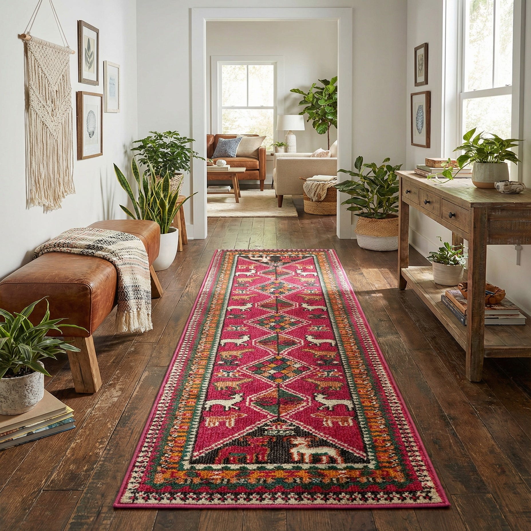 Machine-made of 100% polypropylene, the rug has a low-to-medium pile with a dense, slightly springy hand that defines each motif and gives the surface subtle dimension underfoot. As a runner it works well in a narrow hallway or entry where you want a colorful focal point, along a kitchen aisle to layer color against wood or tile, or down the side of a bed to bring playful pattern into a bedroom. The color palette and folk motifs pair especially well with bohemian, eclectic, or globally inspired interiors, and they can also add a spirited contrast to mid-century modern or neutral contemporary schemes.
