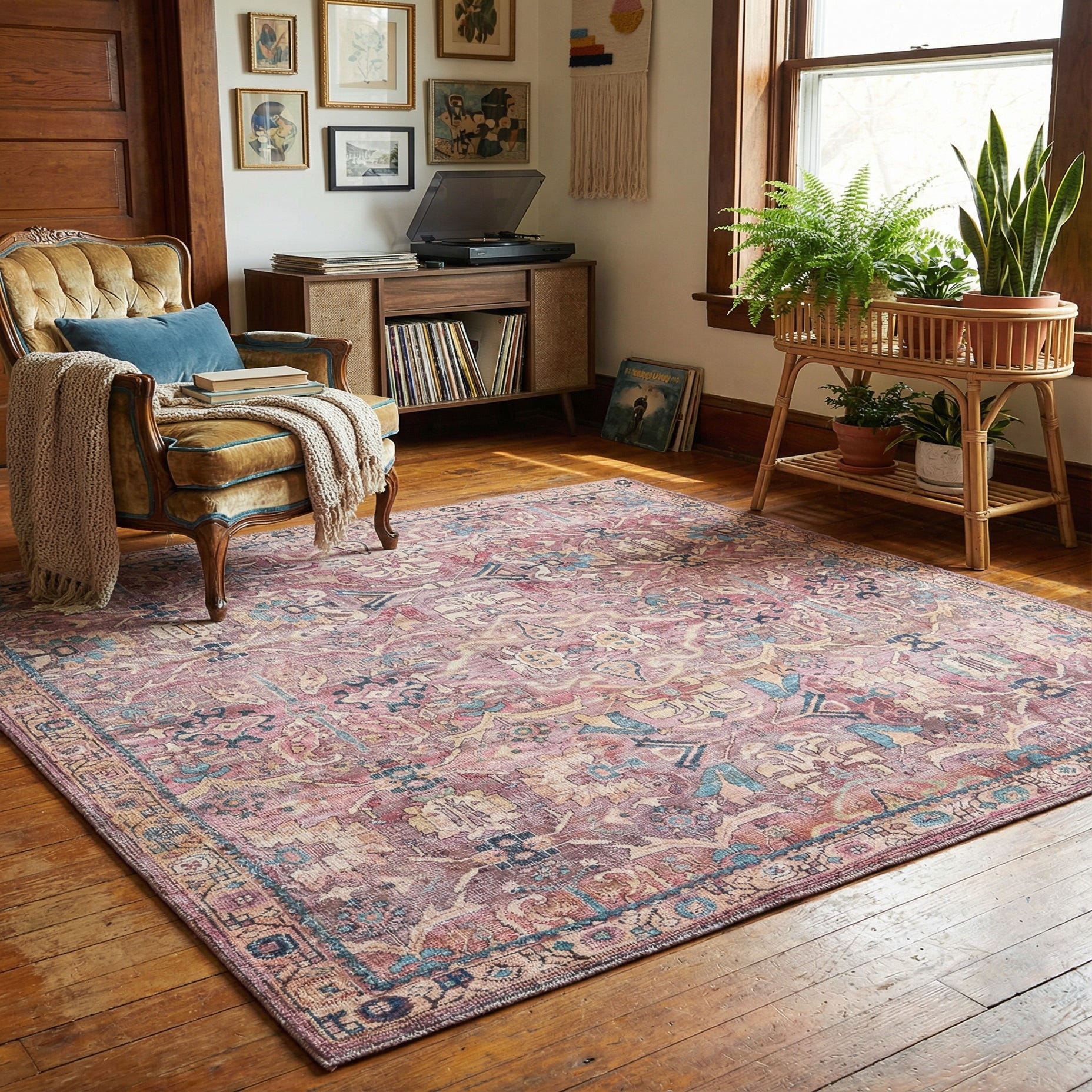 Place this rug under a living room seating arrangement to introduce warm color and pattern without dominating the space, or use it to soften a bedroom with neutral linens and brass or wood accents. It also pairs well with mid-century and eclectic furnishings—layer over natural wood floors for contrast, or combine with navy textiles and turquoise accessories to echo the accent tones. The palette and texture work equally well in a calm, feminine suite or a lively, collected sitting room.