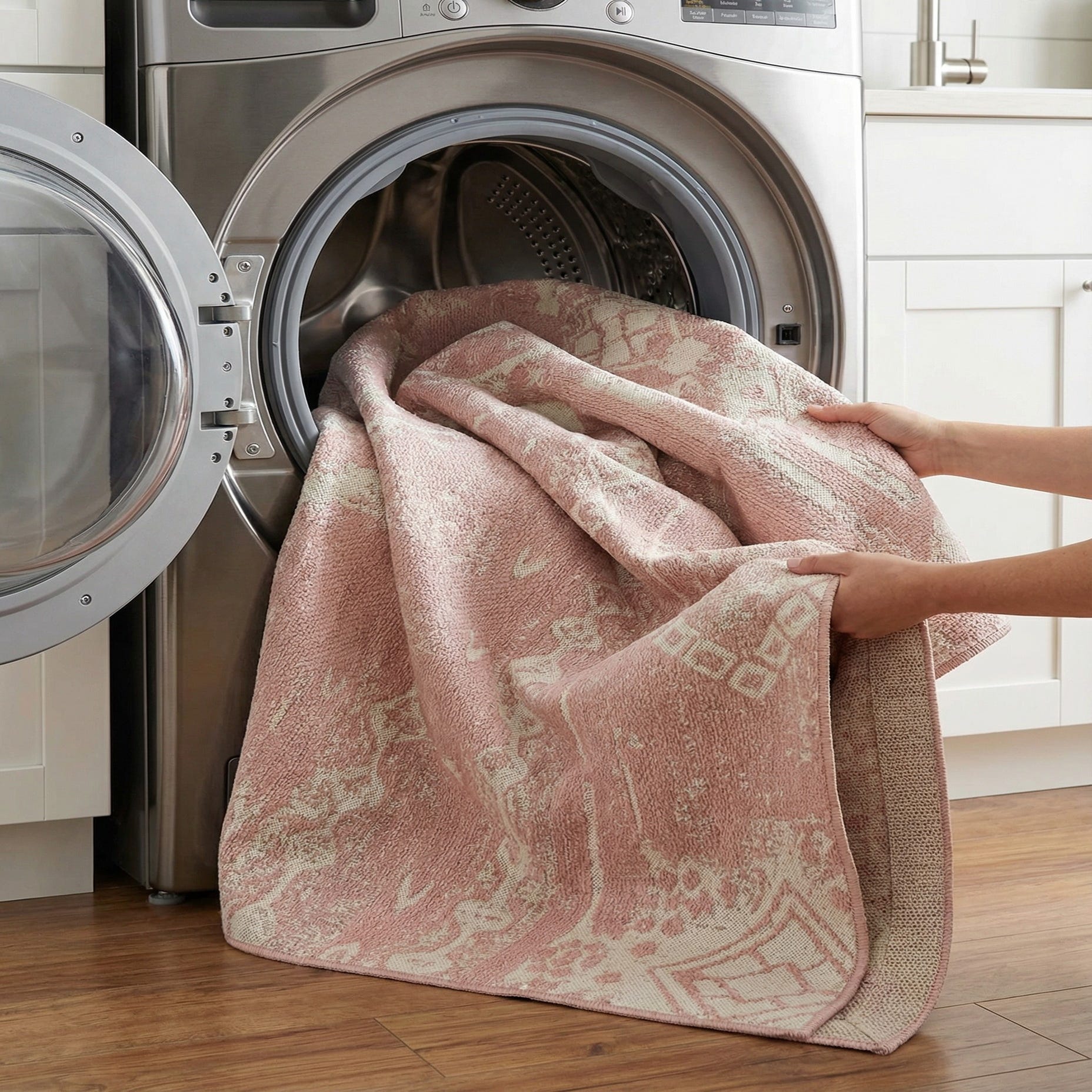 Primary color is Pink. Colors in this rug include: Pink, Ivory.