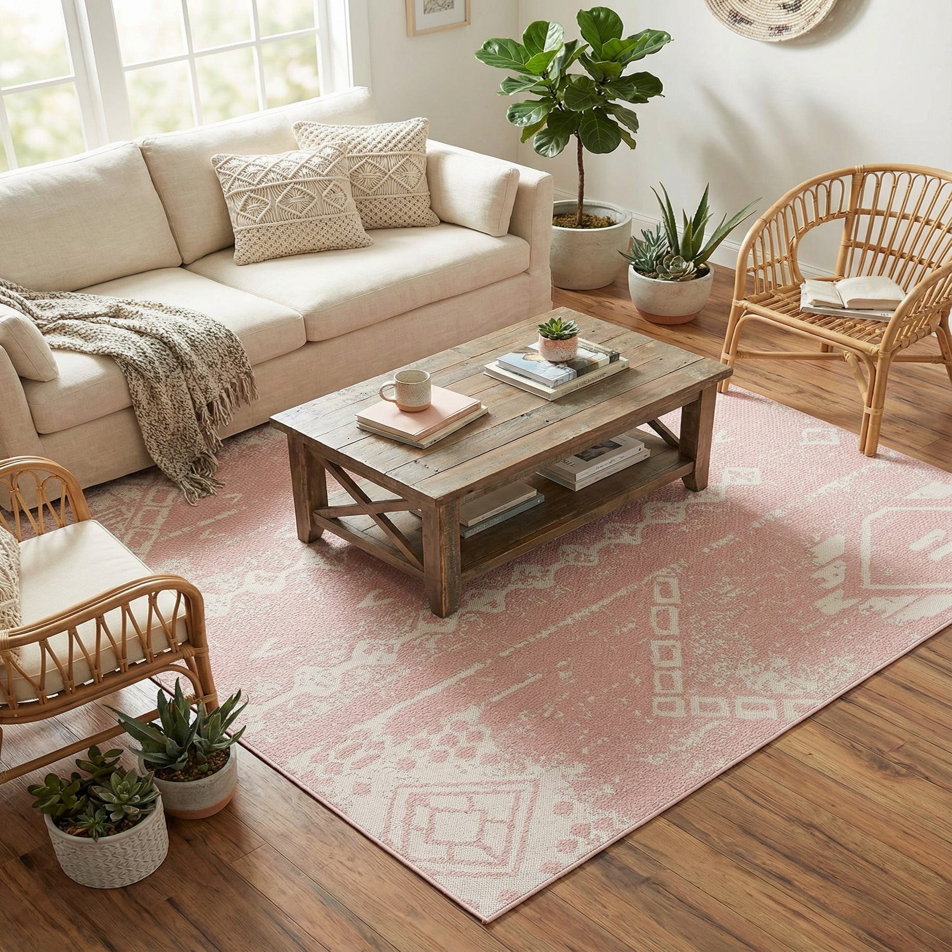 From the Outdoor Bohemian collection, this 7 Ft Square rug presents a playful yet sophisticated design that complements a variety of outdoor and indoor settings. It features a soft pink background highlighted by ivory accents, creating a charming pattern reminiscent of traditional craftsmanship. The polypropylene material ensures durability and a flatweave construction offers a smooth, practical surface.
