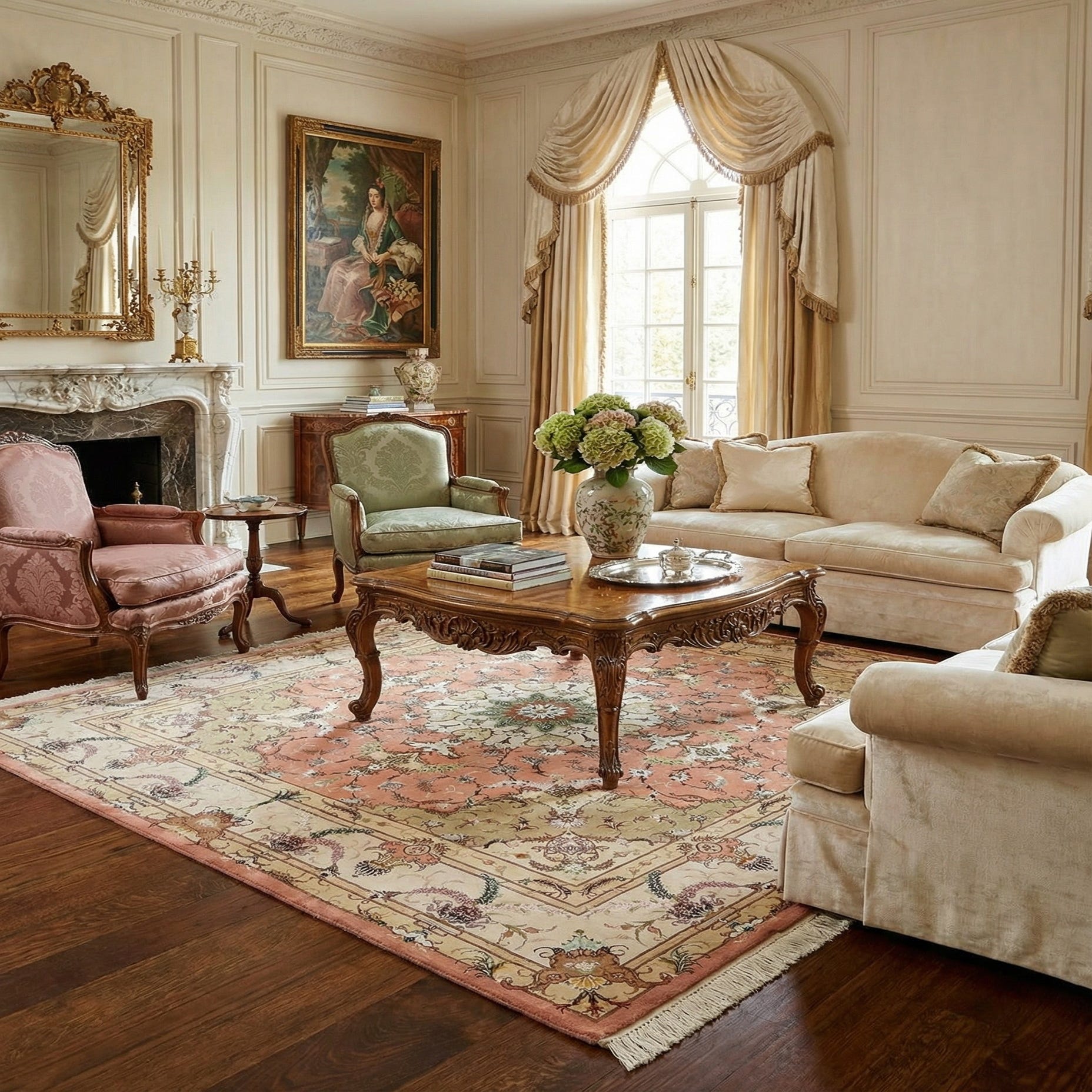 This piece would be a refined choice for a variety of interior design scenarios. Its square shape and size lend itself well for anchoring living room seating arrangements or defining a dining area. The rug's intricate pattern and pastel color palette make it particularly suitable for spaces with a classic, Victorian, or shabby chic aesthetic. Moreover, its lavish yet subtle color scheme allows it to harmoniously blend into interiors with neutral palettes or serve as a gentle contrast in rooms with darker hues. This rug would also complement hardwood or tiled floors, highlighting the beauty of natural textures in a space.