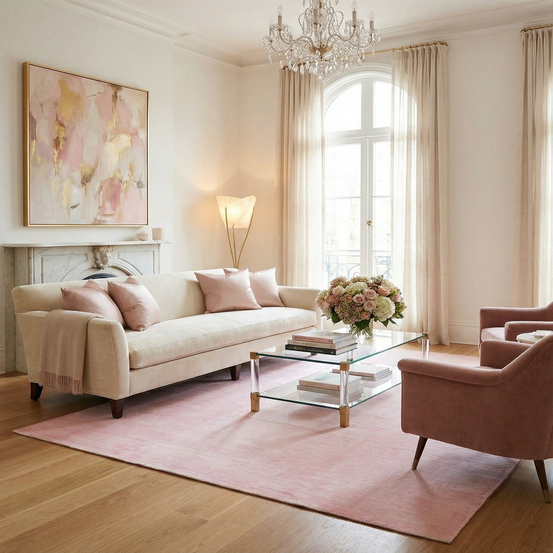 Given its solid pink background, this rug can serve as an anchor for a room with muted or neutral tones, providing a subtle burst of color without overwhelming the space. It would complement interiors with modern minimalistic aesthetics or rooms that employ pastel palettes for a soft, calming ambiance. Its woolen texture adds warmth to any living area, bedroom, or office space while maintaining a chic, polished look.