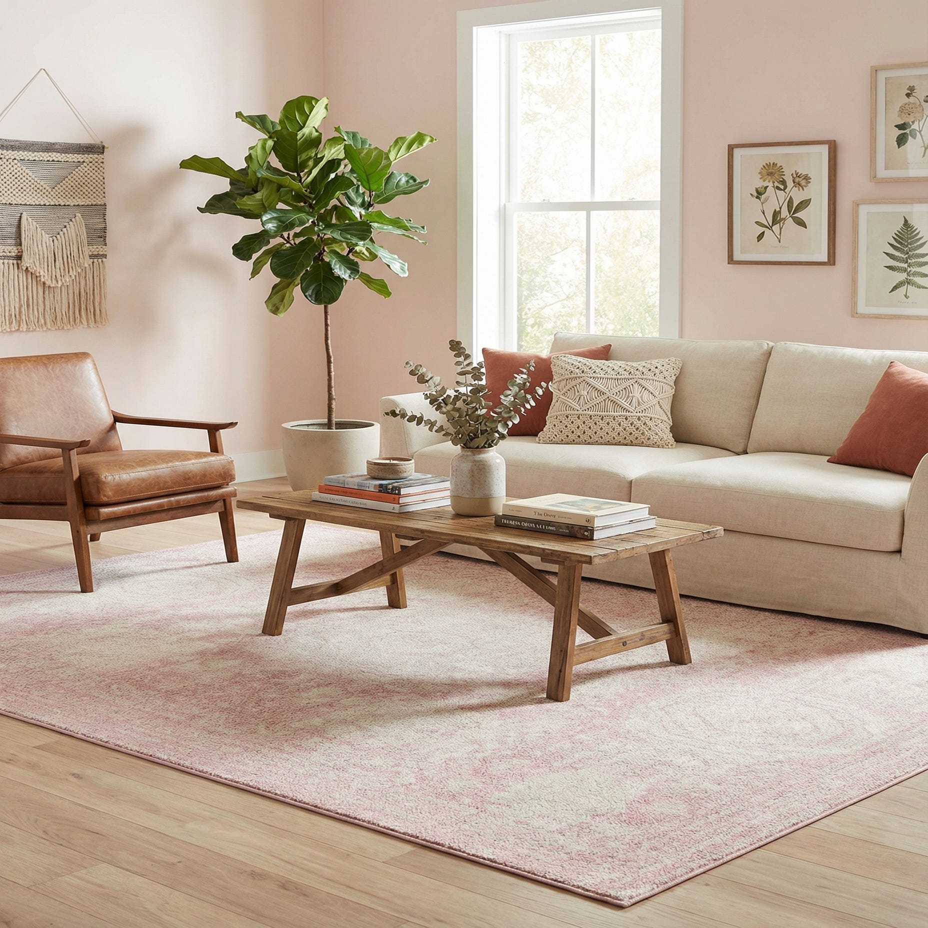 This rug pairs well with neutral upholstery and warm wood tones to let the pink background be the room’s focal point, or layered beneath simple, modern pieces to introduce a subtle vintage touch. It works nicely in a bedroom to soften the space, in a living area as an understated centerpiece, or in a cozy reading nook where the muted pattern adds warmth without overwhelming the décor.