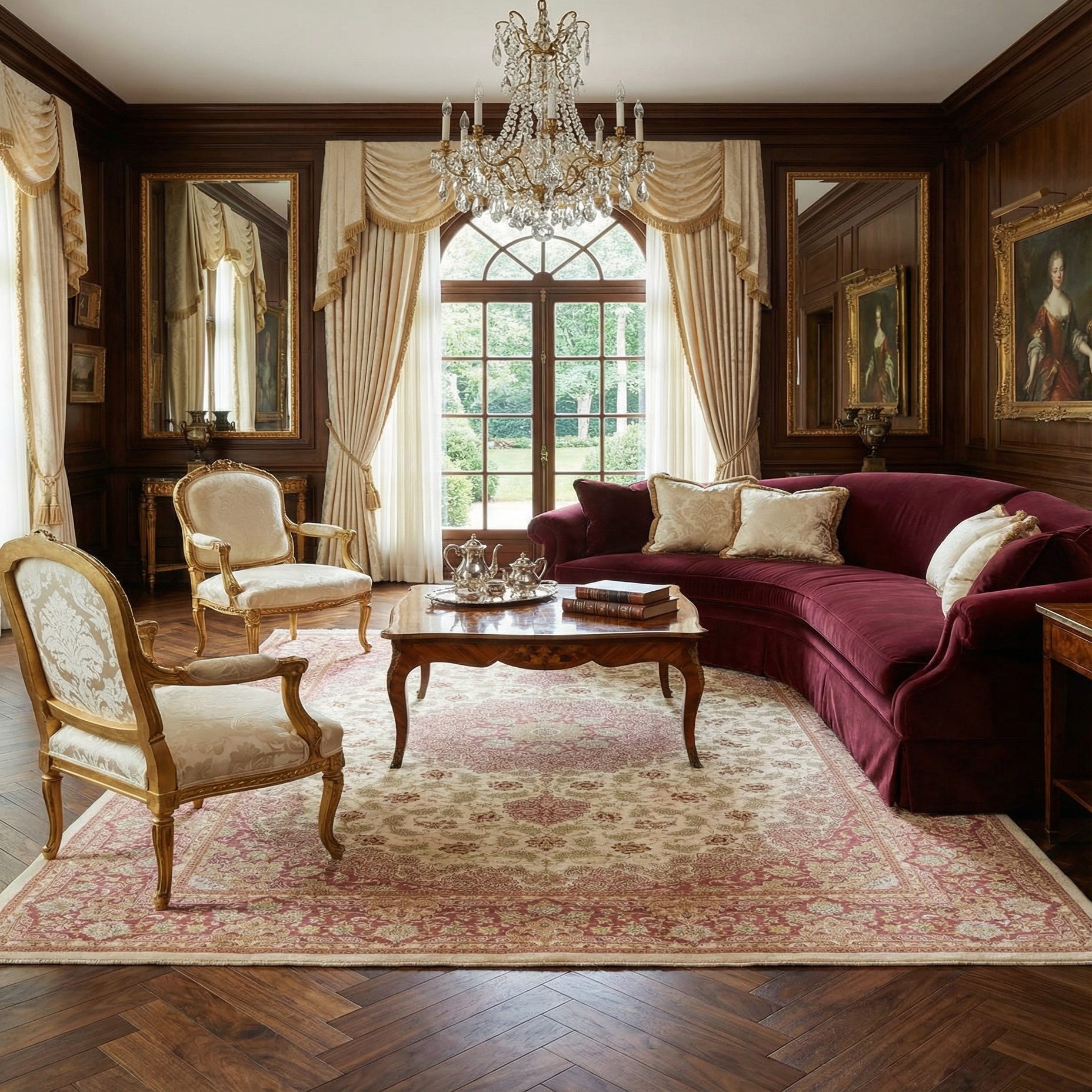 Use this rug to anchor a seating area in a formal living room, pairing it with warm wood tones and neutral upholstery to let the pink ground become a gentle focal point. It also suits a bedroom where the soft color palette enhances a calm, traditional atmosphere, or a dining room where the clear central medallion can sit beneath a table and frame place settings. The rug complements interiors that blend classic detailing with simple, contemporary furnishings, and fits well with blush or neutral palettes, antique wood, and muted metallic accents.