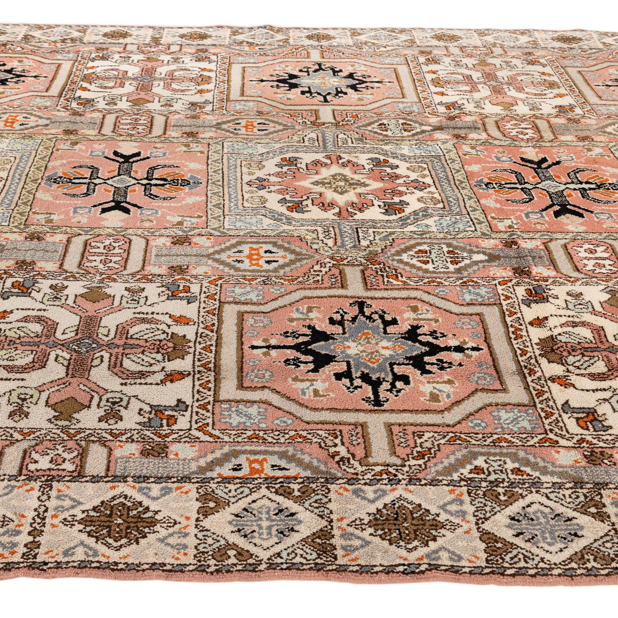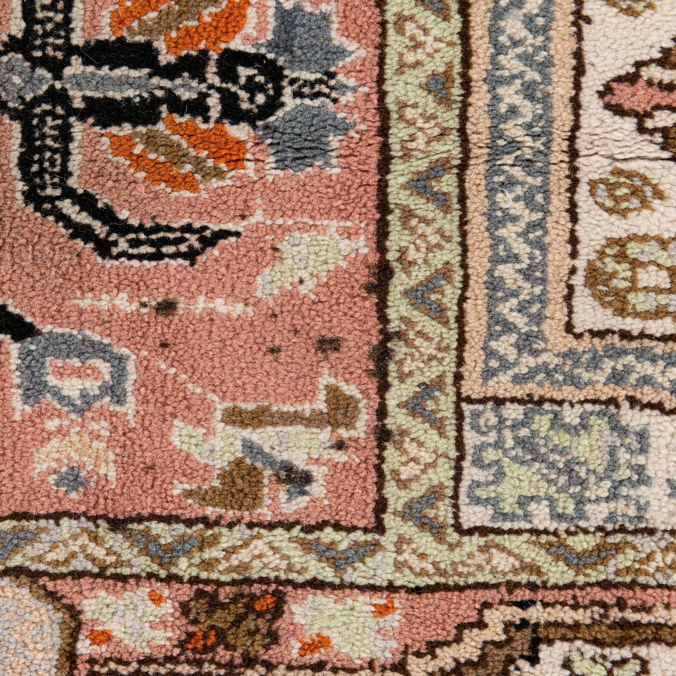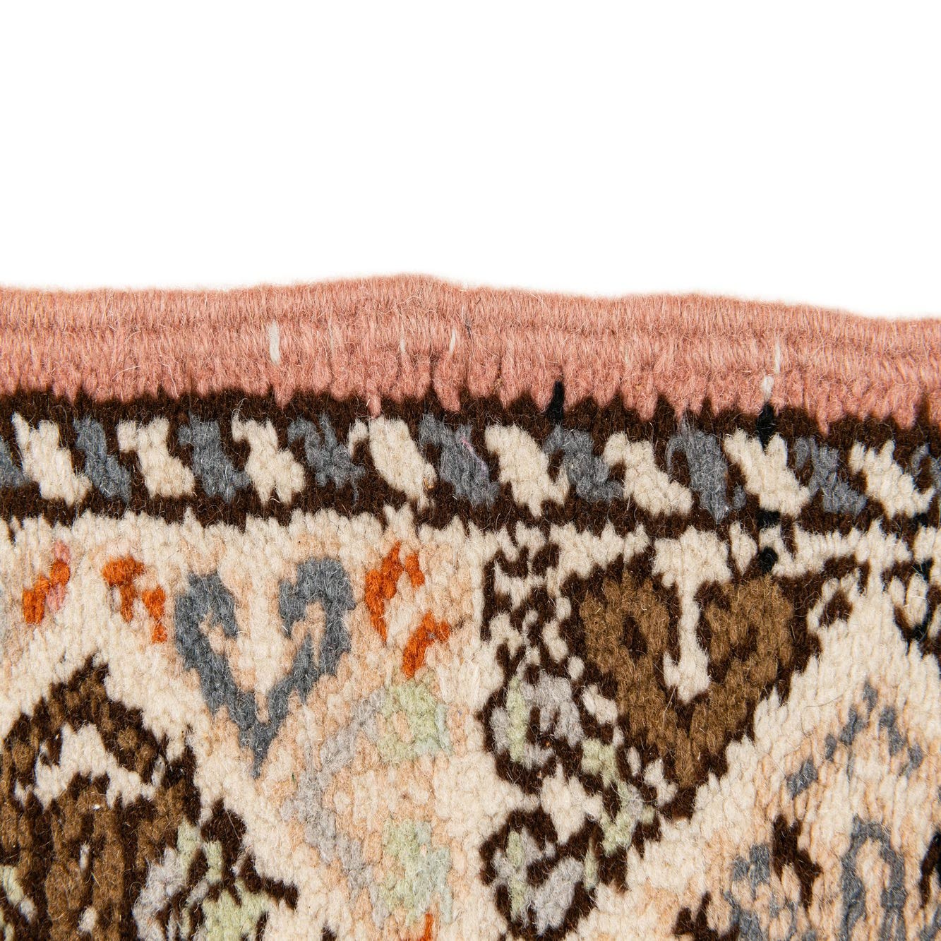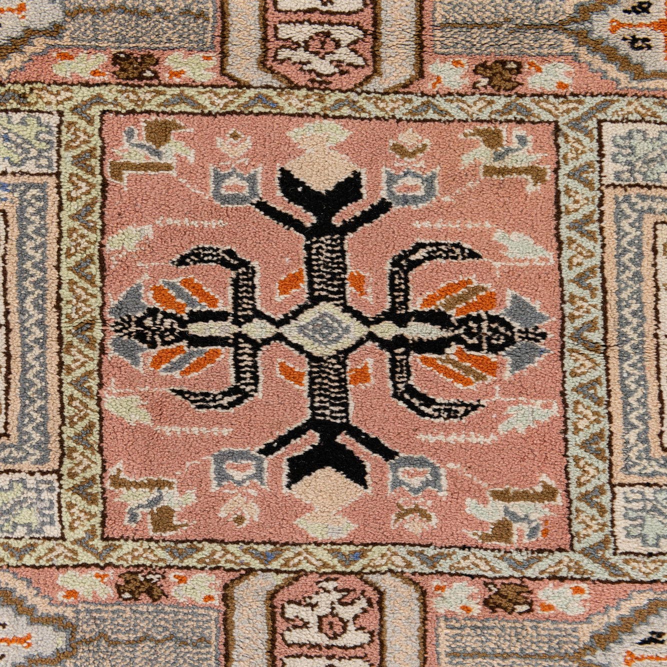 Primary color is Pink. Colors in this rug include: Pink, Black, Brown, Ivory, Light Blue, Orange.