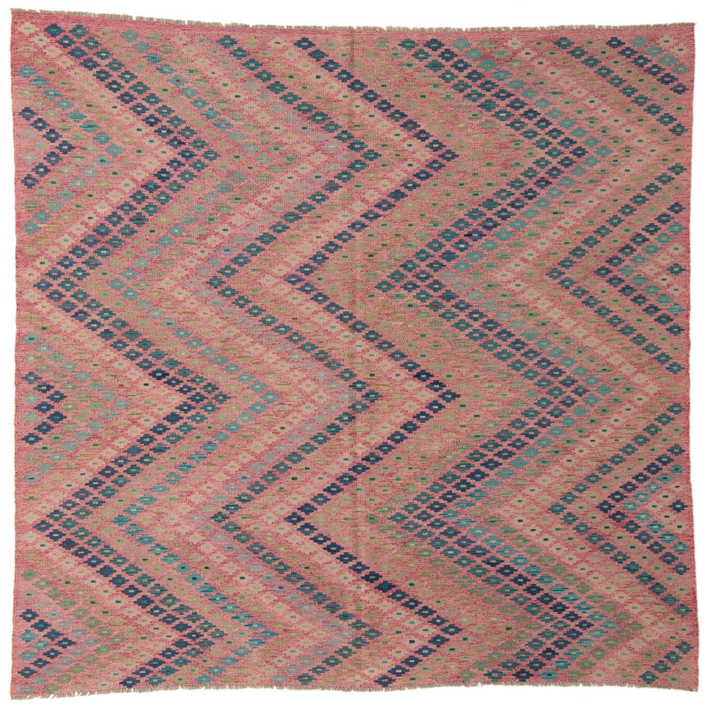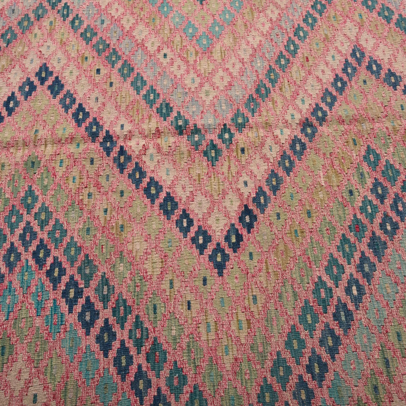 A 7x10 rectangular flatweave wool rug featuring a Southwestern tribal pattern in shades of pink, blue, and green.