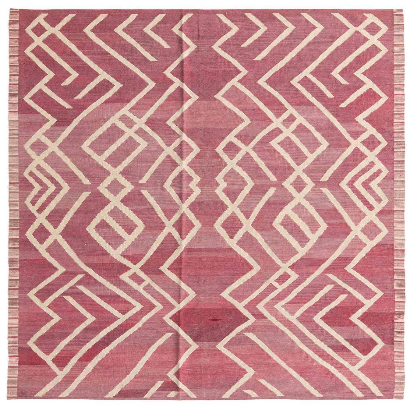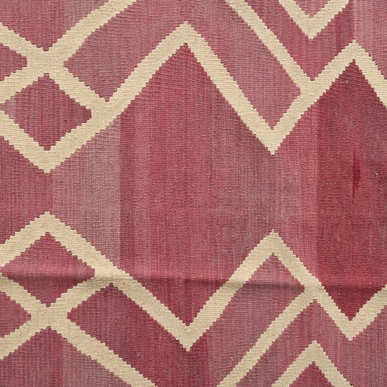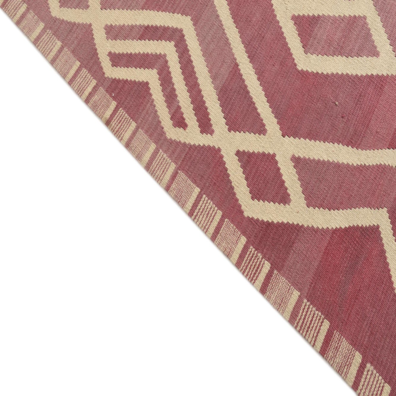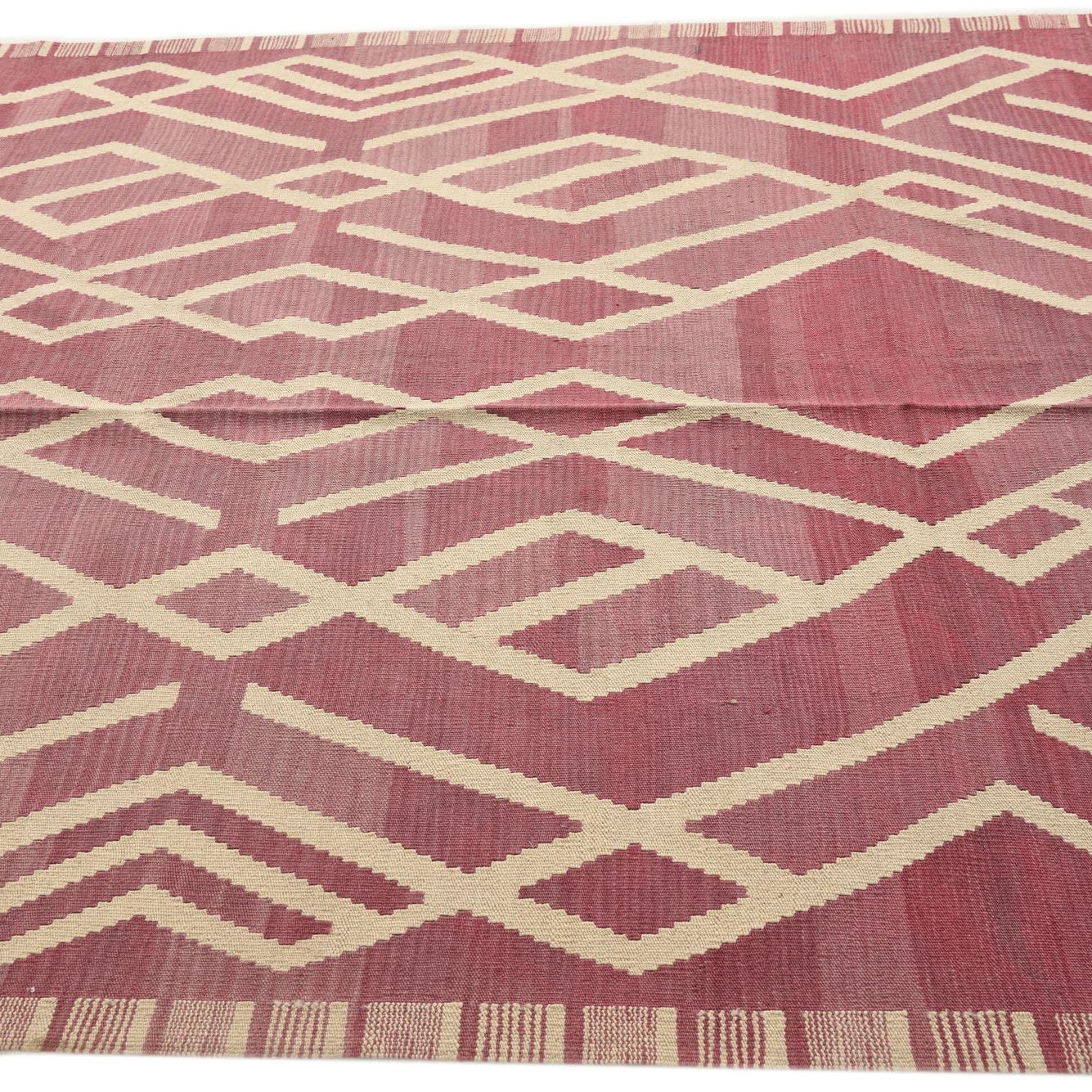 A 7x10 rectangular flatweave wool rug in varying shades of pink with a bold, off-white tribal geometric pattern.