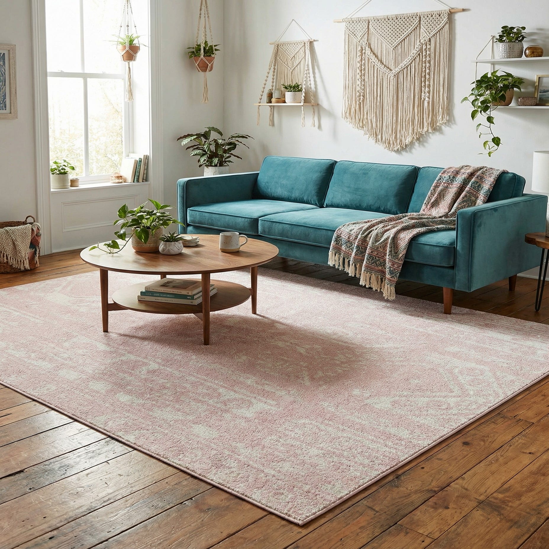 Machine made from 100% polypropylene, the rug has a low, even pile with a slightly cushioned hand that feels smooth underfoot and holds its shape through everyday use. The muted palette works well in a variety of interiors—use it to anchor a neutral living room with light woods and brass accents, layer it under a bed to soften a feminine or Scandinavian bedroom, or place it in a nursery or dressing area where the gentle pink and ivory palette adds warmth without overpowering the space.