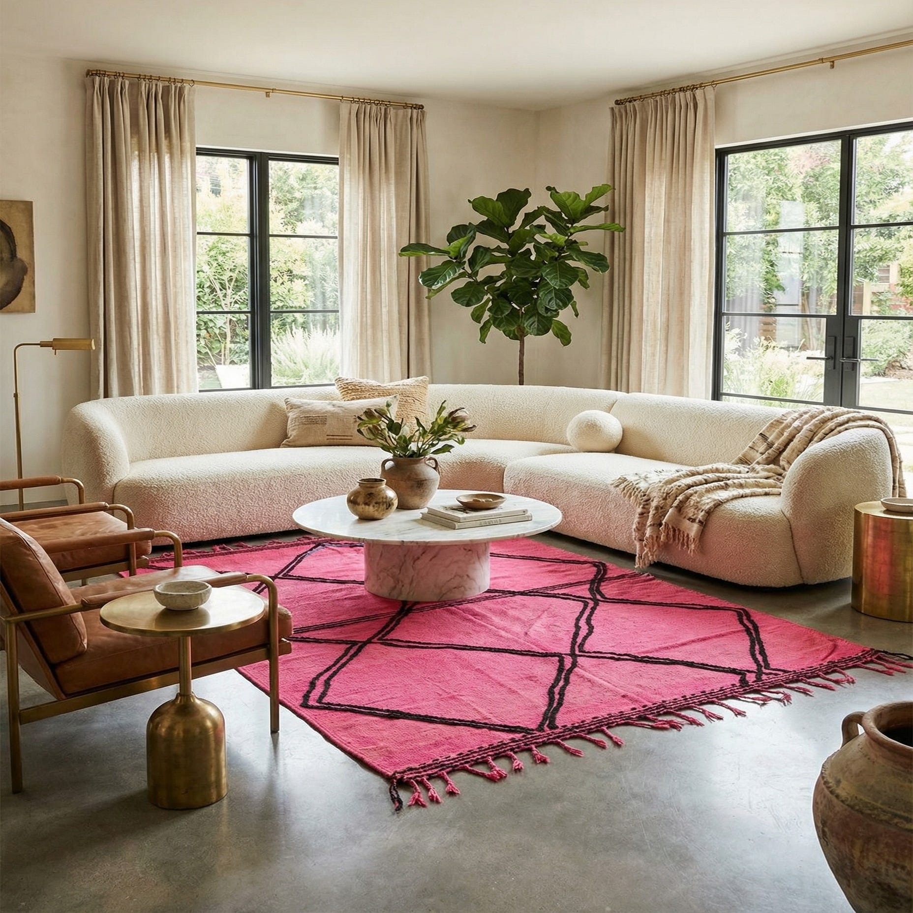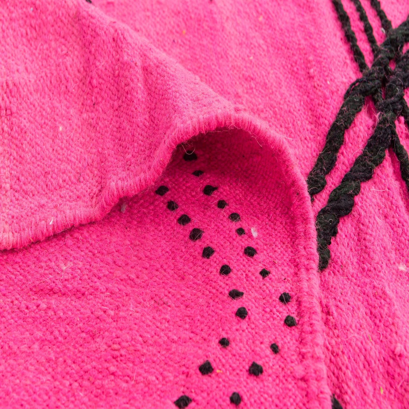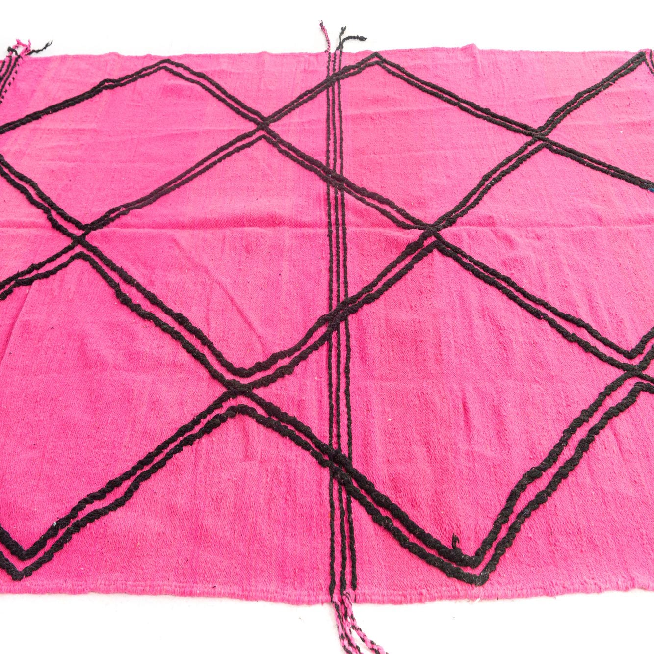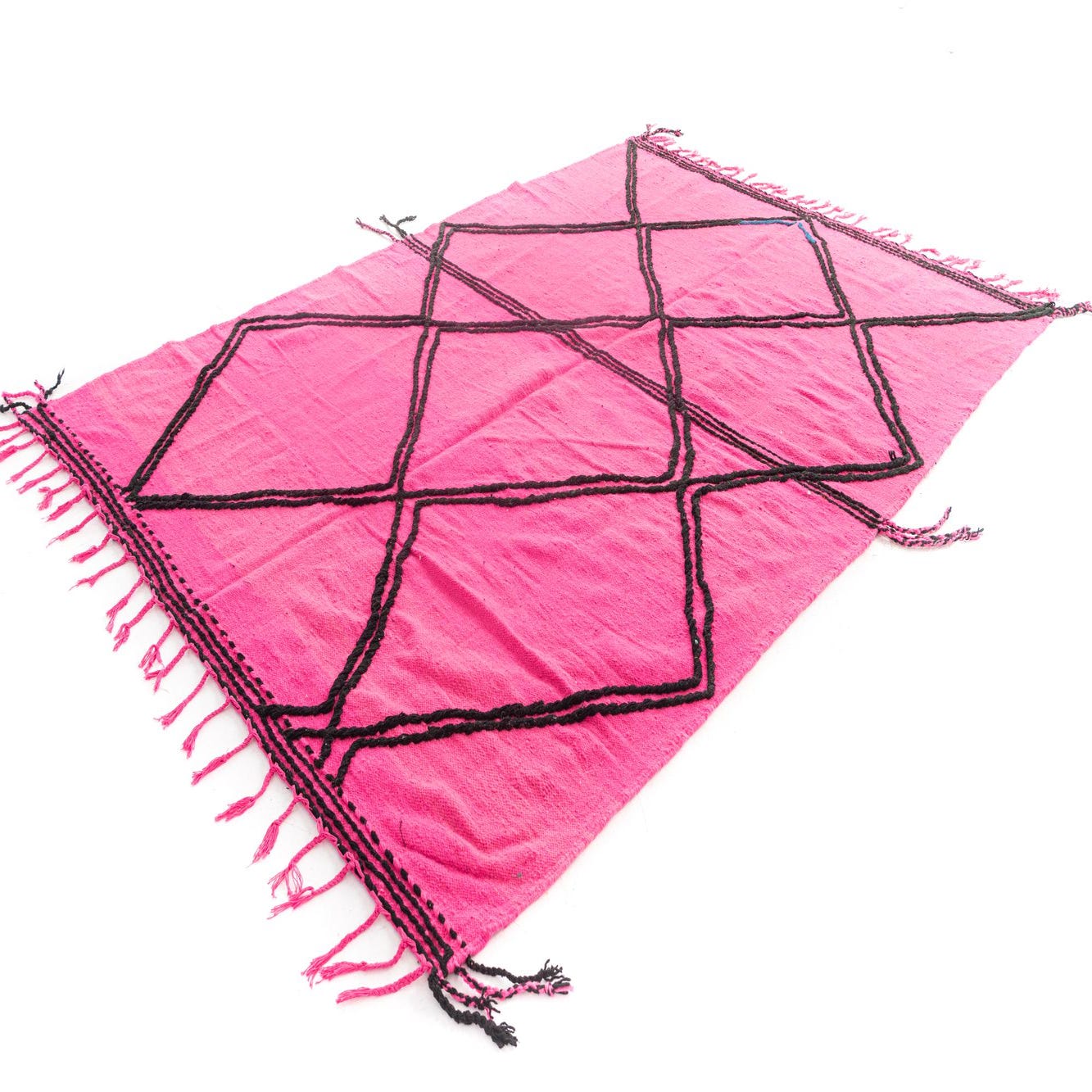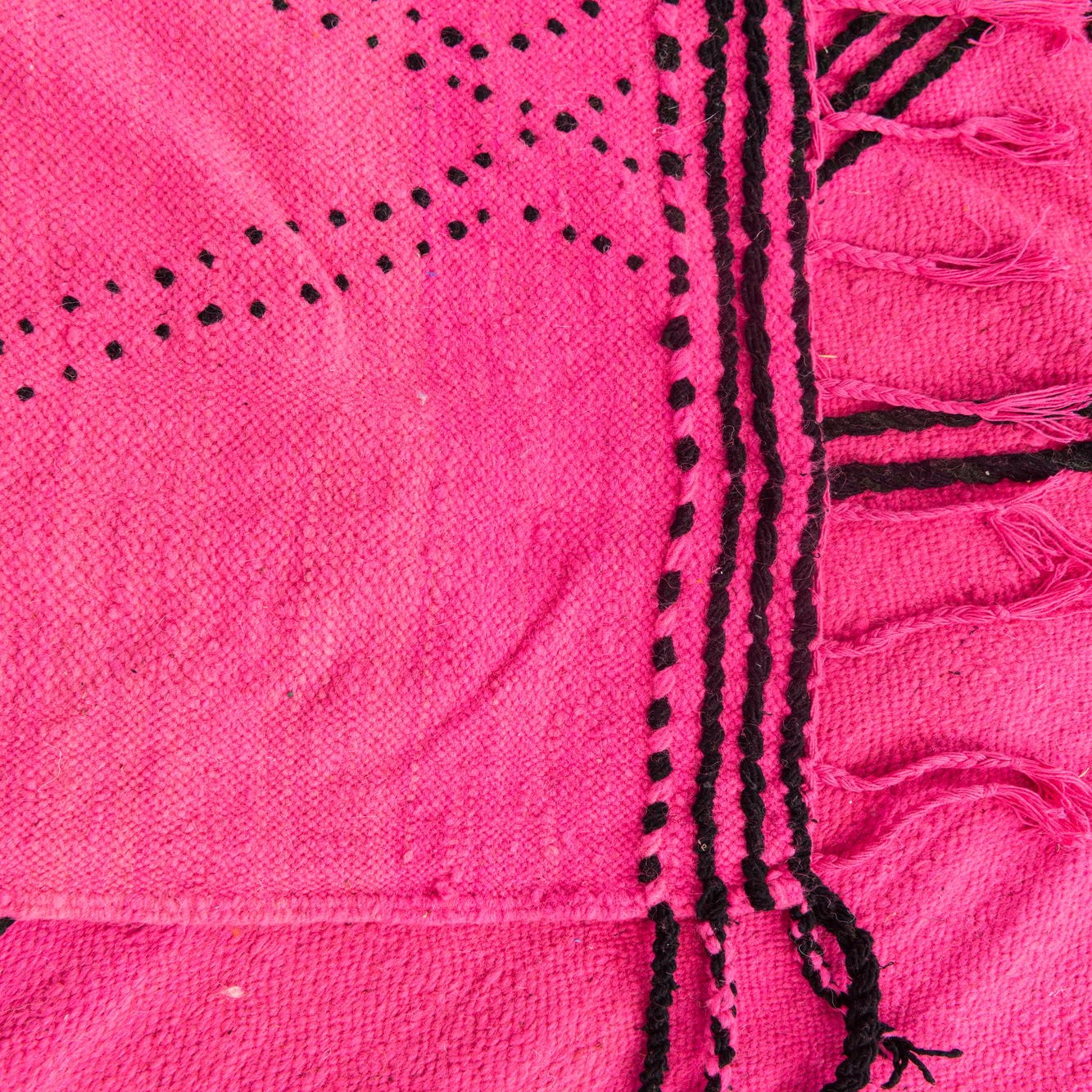 A vibrant 7x10 rectangular pink shag rug with a bold black tribal diamond pattern and fringe.