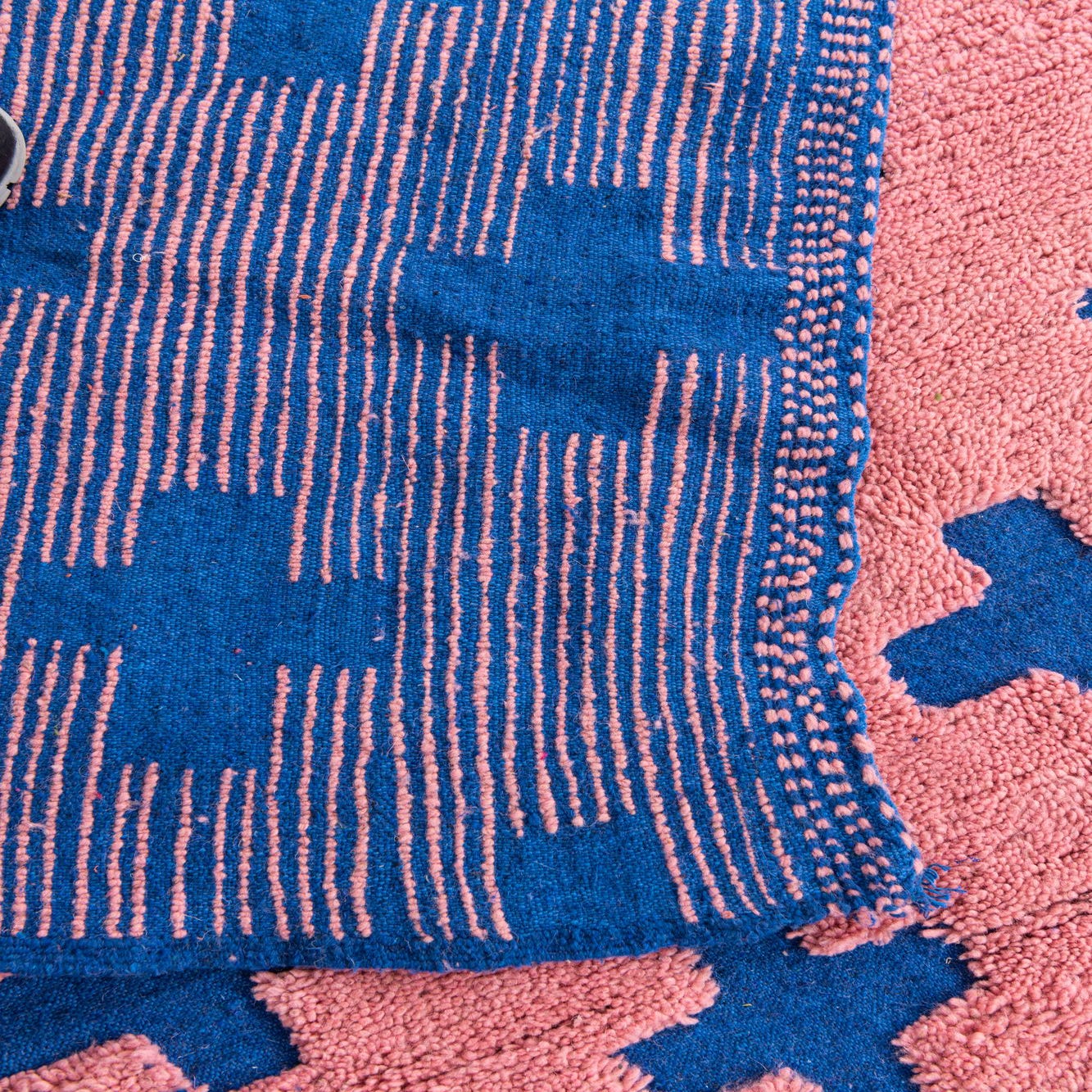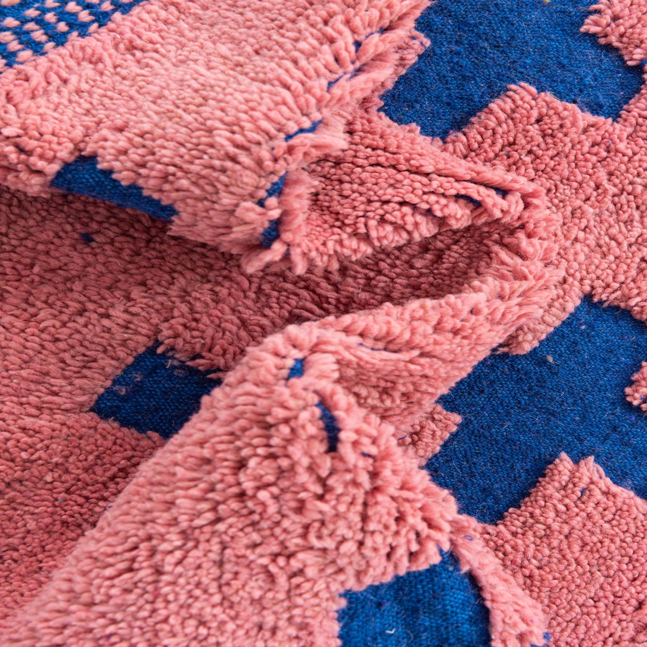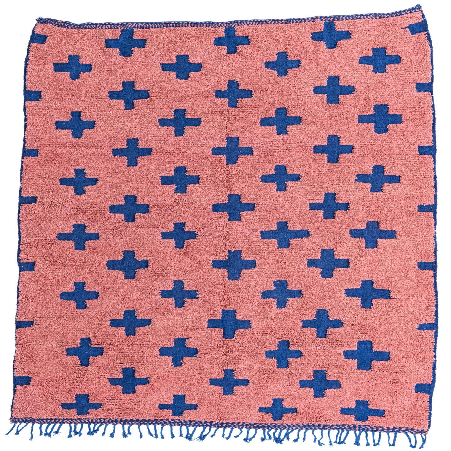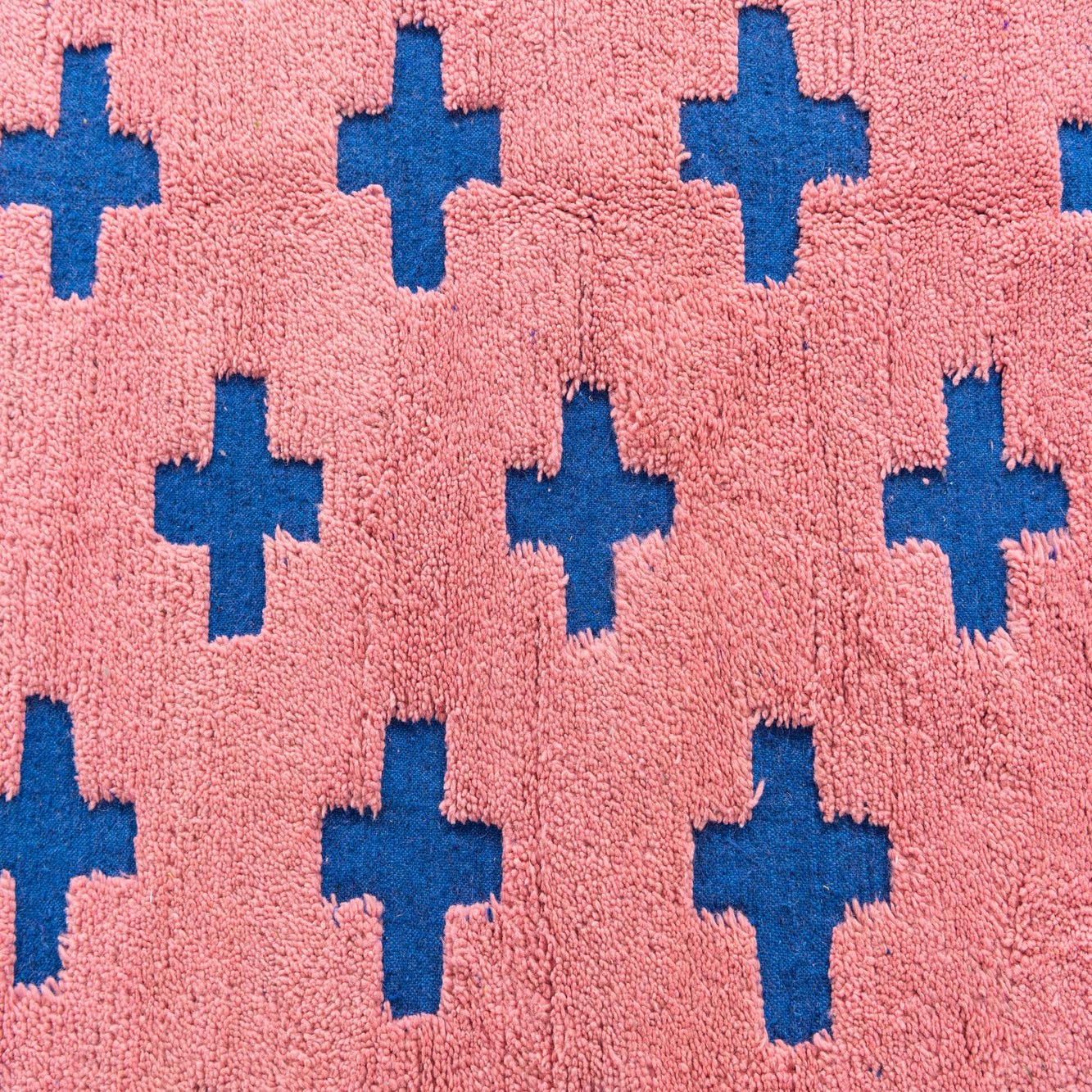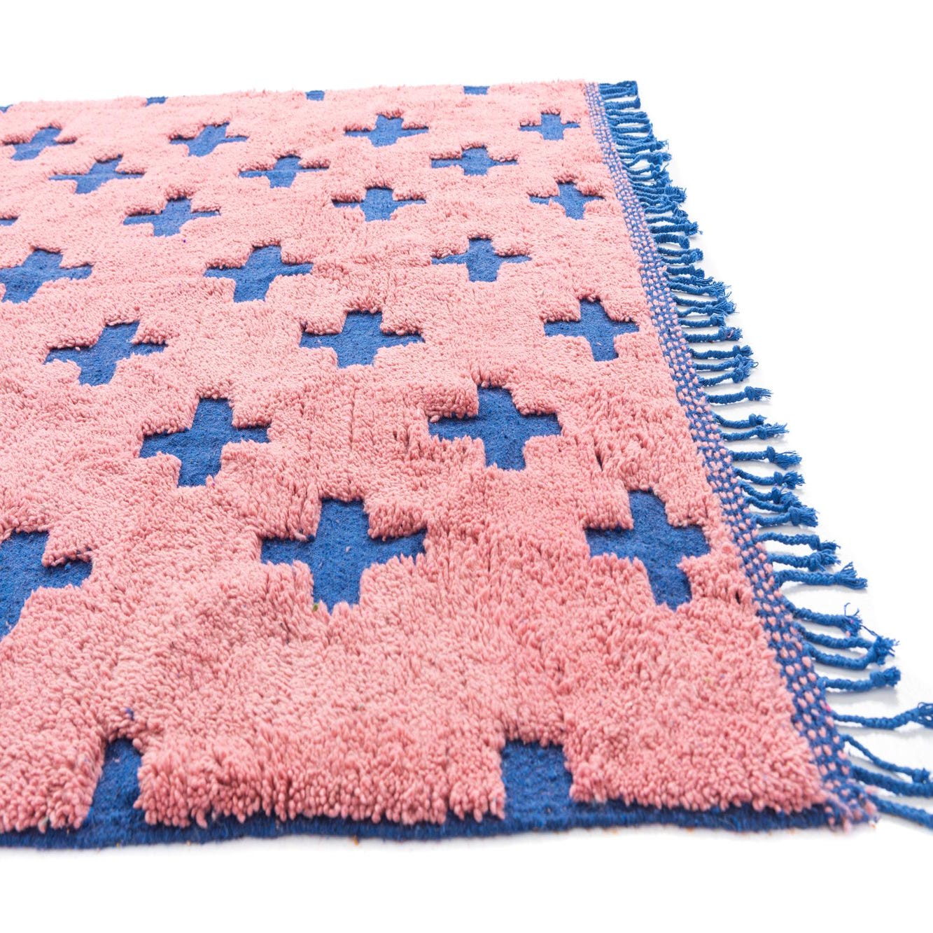 This Moroccan Collection rug offers a bold yet simplistic statement piece for a variety of interior spaces. Hand-knotted from 100% wool, the rug displays a characteristic durability and a soft, inviting texture. Presenting a vibrant pink background, the design is punctuated with a repeating pattern of deep blue cross-like motifs, lending a contemporary geometric aesthetic to its traditional craftsmanship. The fringe detail on either end adds a classic finish to this piece.