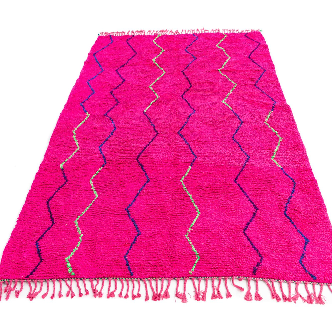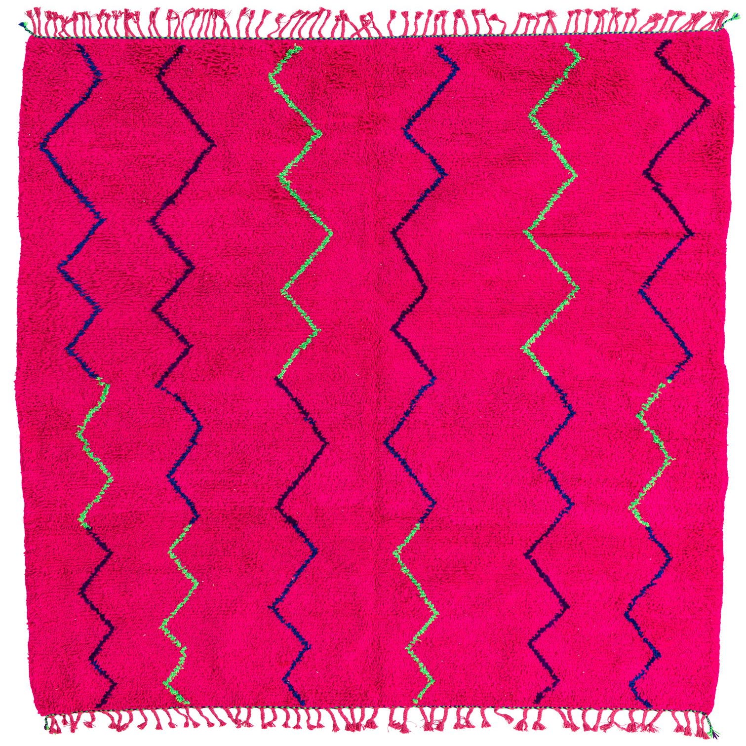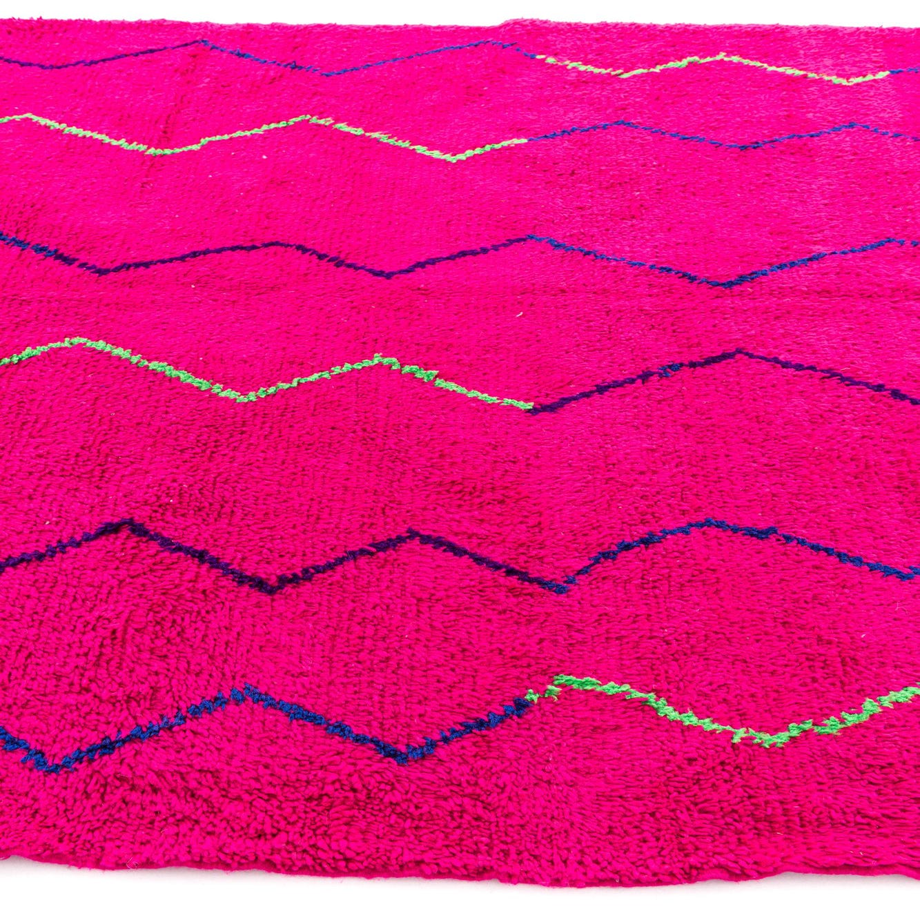 This Moroccan collection rug features a vibrant pink background, setting a lively tone for any room it's placed in. The geometric pattern is composed of bold blue outlines filled with a zigzagging green detail that instills a sense of dynamic movement within the piece’s design. The hand-knotted construction of 100% wool speaks to the longevity and tactile appeal, offering a plush texture underfoot.