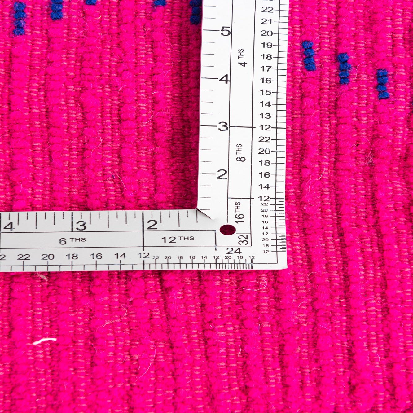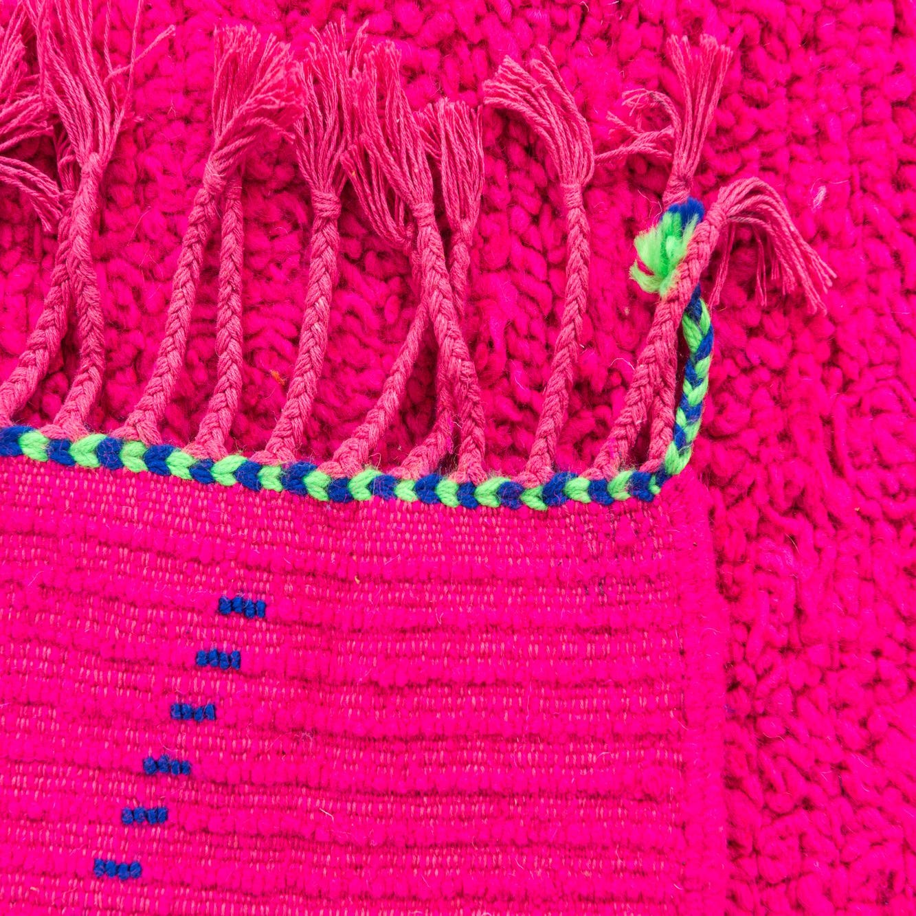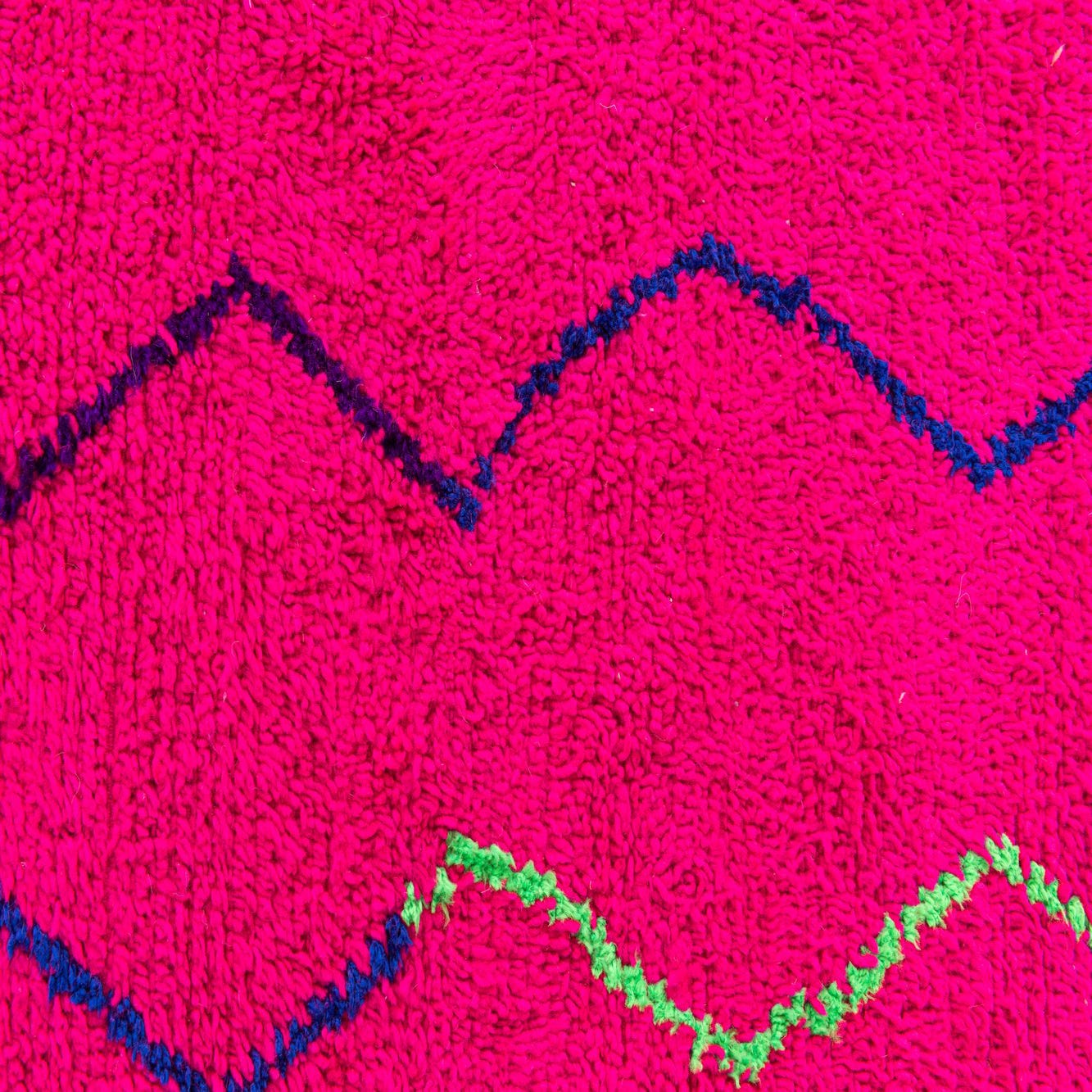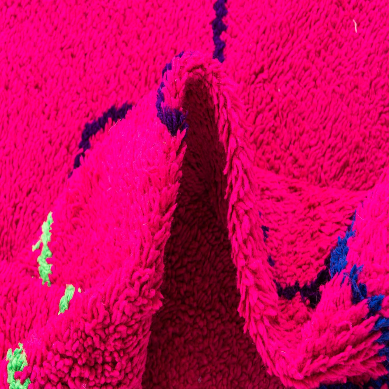 This Moroccan collection rug features a vibrant pink background, setting a lively tone for any room it's placed in. The geometric pattern is composed of bold blue outlines filled with a zigzagging green detail that instills a sense of dynamic movement within the piece’s design. The hand-knotted construction of 100% wool speaks to the longevity and tactile appeal, offering a plush texture underfoot.